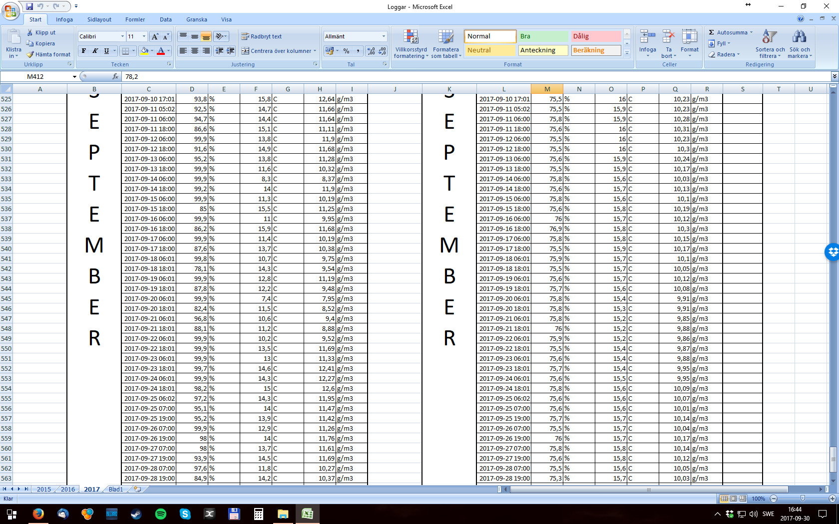 Om ni kollar på bilden så ser ni hur luftfuktigheten har rört sig under September. Spalten till vänster är från givaren som sitter monterad på utsidan och spalten till höger är för givaren monterad inne i källare.