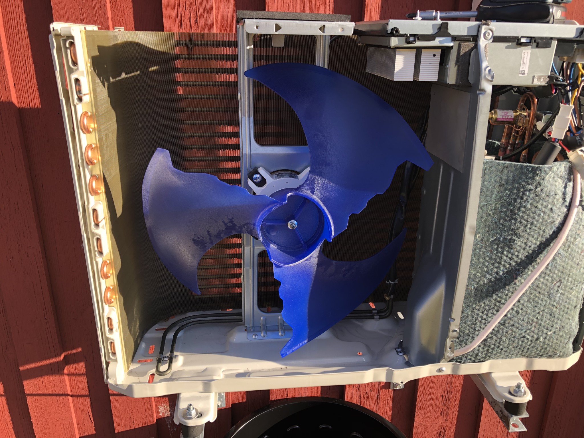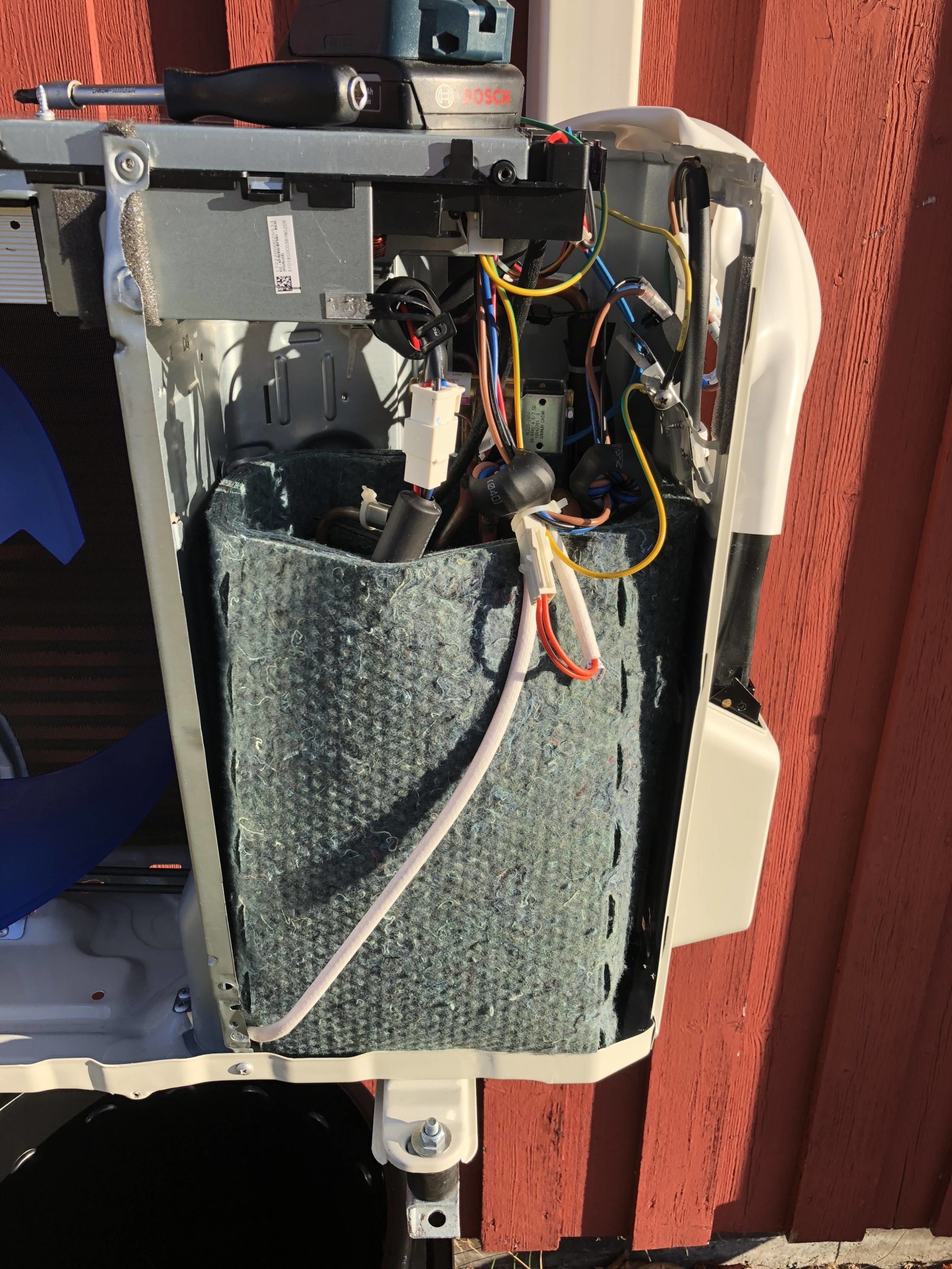 Efter tidigare googlingar på jula-pumpar så var jag nyfiken på om det fanns nån isolering alls i utedelen, med tanke att göra en insats om det hade saknats. Men utvecklingen går framåt och det sitter hyggligt med isolering kring kompressor och merparten rör, så den får vara som den är