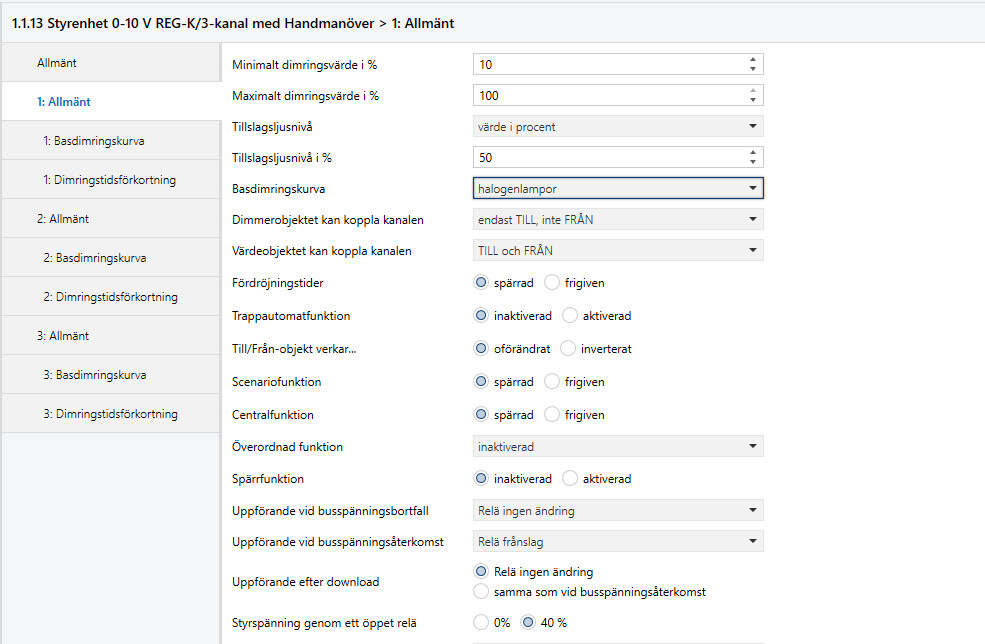 Så här ser det ut i ETS, men jag har även provat att fippla lite med konfigurationen utan resultat. Jag använder både brytfunktionen (som fungerar utmärkt) och styrsignal (som får aktorn att låta, men inte ger annan effekt).