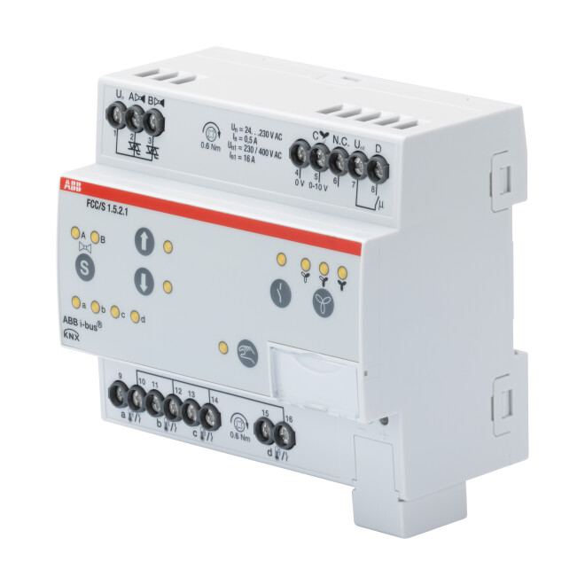 Det finns särskilda fancoil-aktorer för att styra fläktkonvektorer. T.ex. denna från ABB som har 0-10V utgång för fläkten, 2 st utgångar för ställdon värme och/eller kyla, 1 st utgång för t.ex. extra värmare och 4 st ingångar för daggpunktssensor, tempsensor och fönsterkontakt.