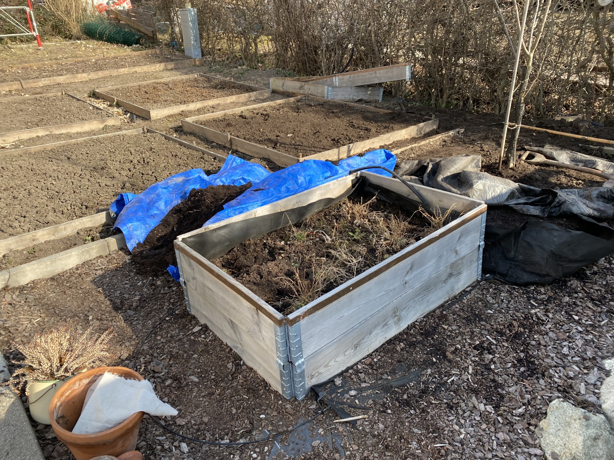 Vi ska göra gångar runt/mellan våra odlingar och vill gärna ha träflis. Som det är nu (både där det bara är jord och där det är bark) blir det vattenansamlingar här och var, så jag klurade på om lösningen är: markduk, makadam, träflis? Har lite andra projekt i vår, så vill gärna hitta någon lösning som går någorlunda snabbt att fixa till.
