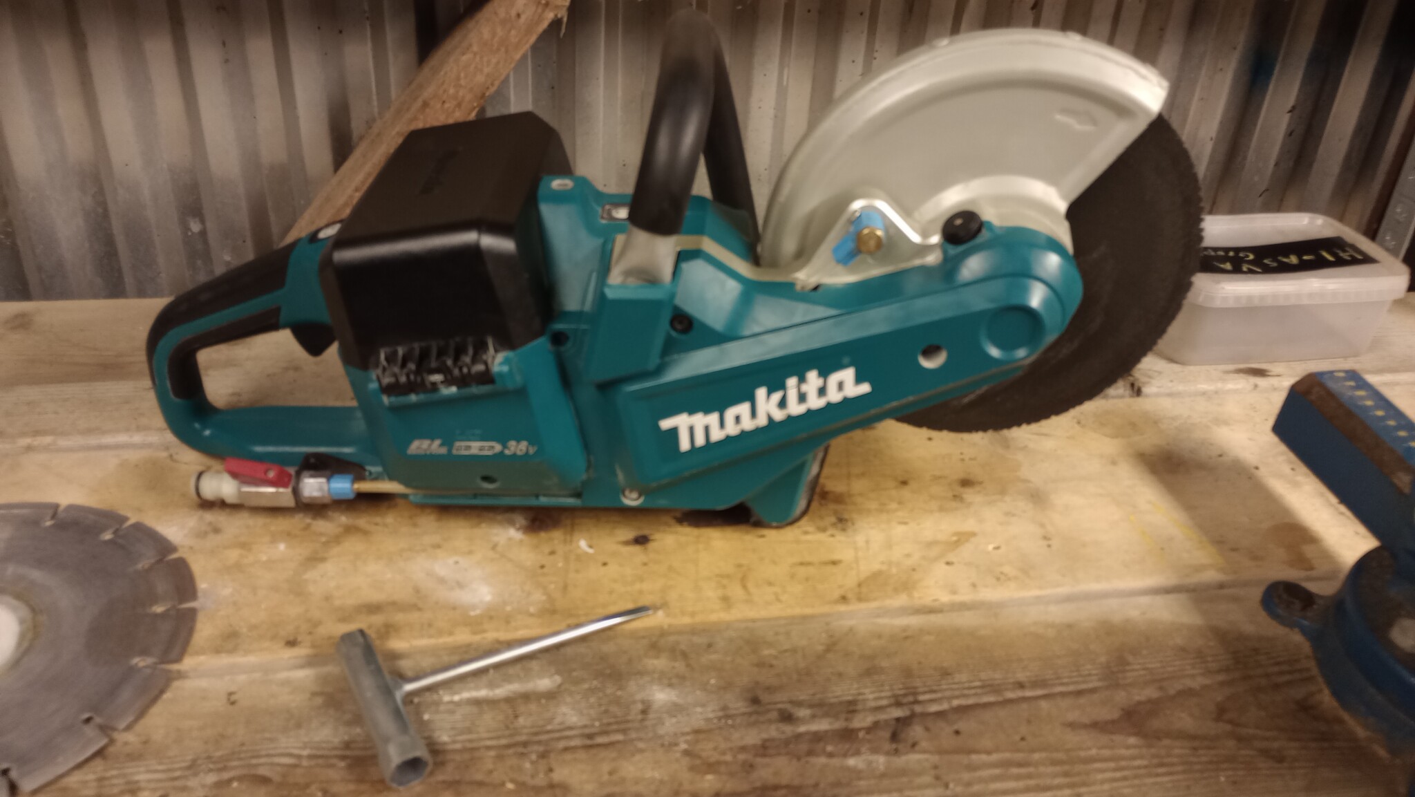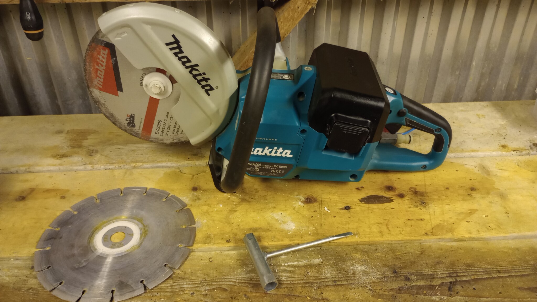 Kapskiva för metall(begagnad) och diamantskiva för betong/murverk(begagnad) ingår.
