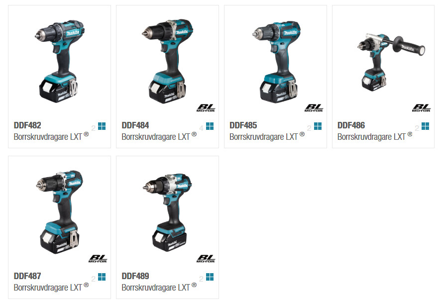 Du kan gå in på https://www.makita.se/products/sladdlösa-borrmaskiner-lxt-18v.html och jämföra 4 maskiner i taget.Hemingway skrev: