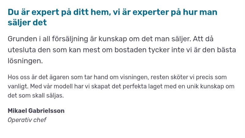 Som säljare håller du i visningarna men skriver även din annonstext själv, vilket är det enda jag kan tänka mig att folk är olika bra på. För egen del har jag lätt för skrivdelen då det är en hobby för mig (sålt mycket annat genom åren). Man kan inspireras av andra annonser och grannar i sina formuleringar. Anser mig skriva bättre än många andra mäklare som jag ofta tycker utelämnar eller missar saker. Undviker även floskler personligen.