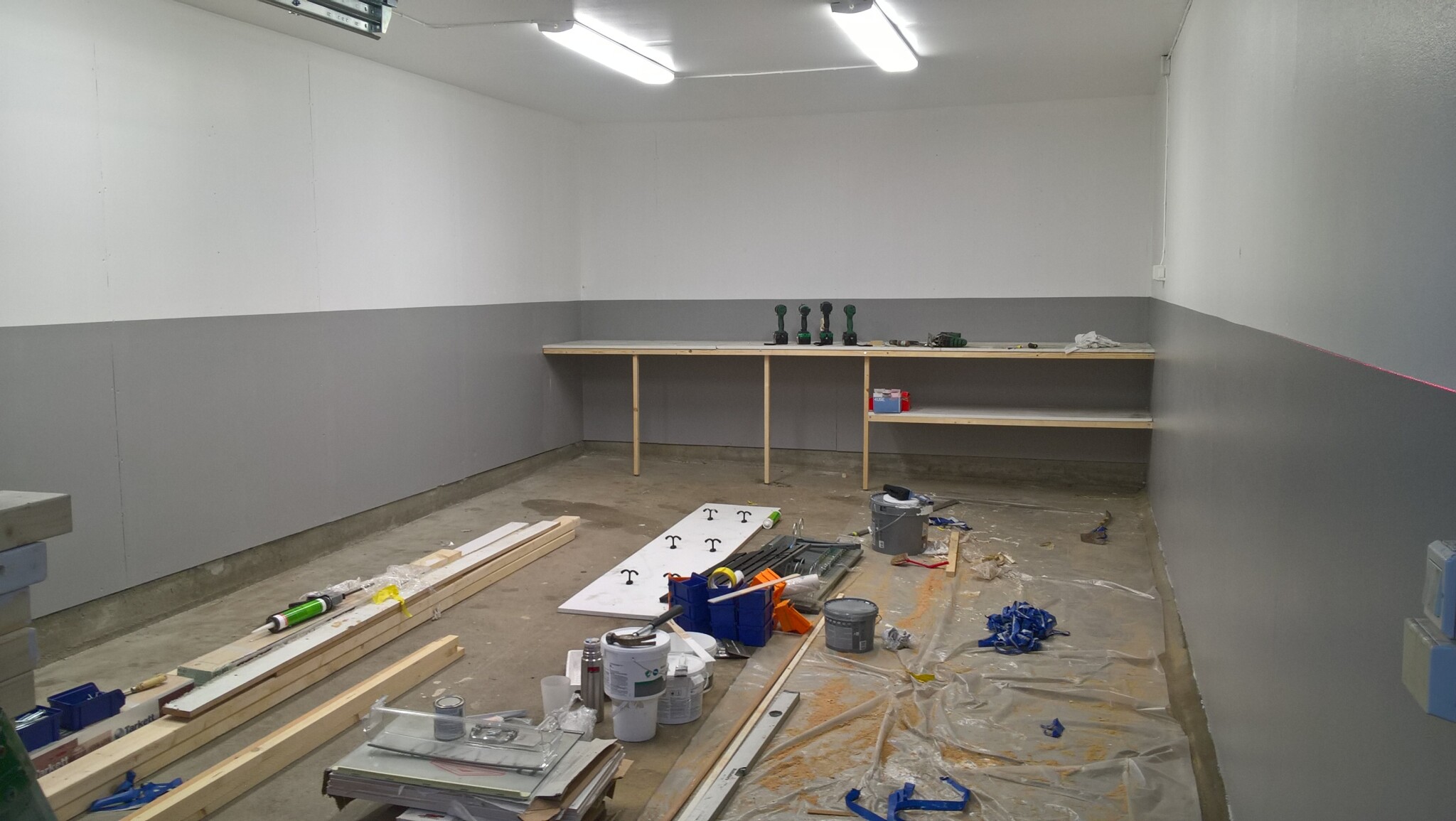 Vi har ett garage med vita väggar och vitt tak. Just nu är väggarna klädda med vävtapet som är målad i vit färg.