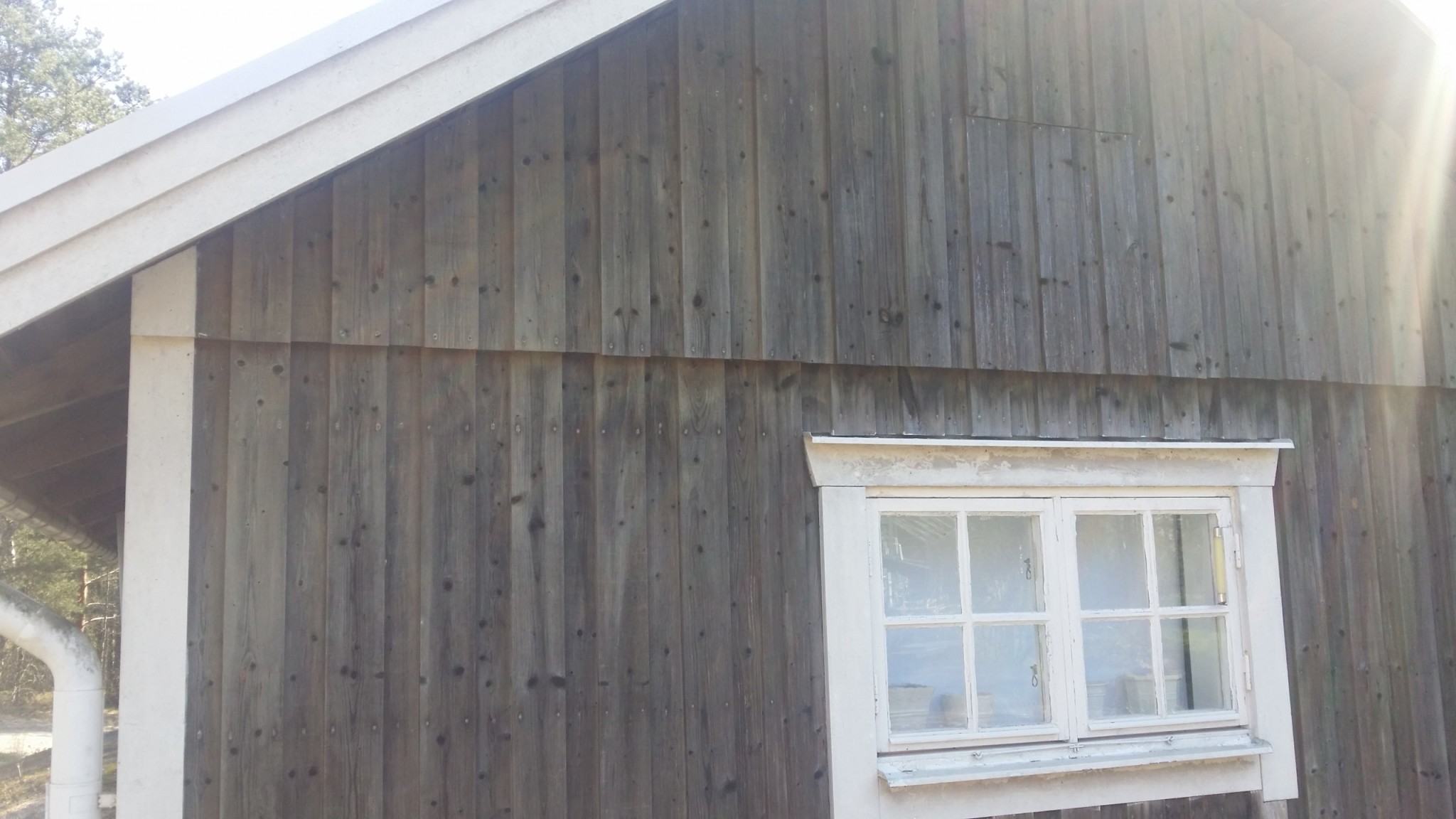 Stugan är från 82, den har nog inte varit målad sen utan har haft denna vitriol eller vad det nu är. Tror inte färgen kommer att jämna ut sig mer.