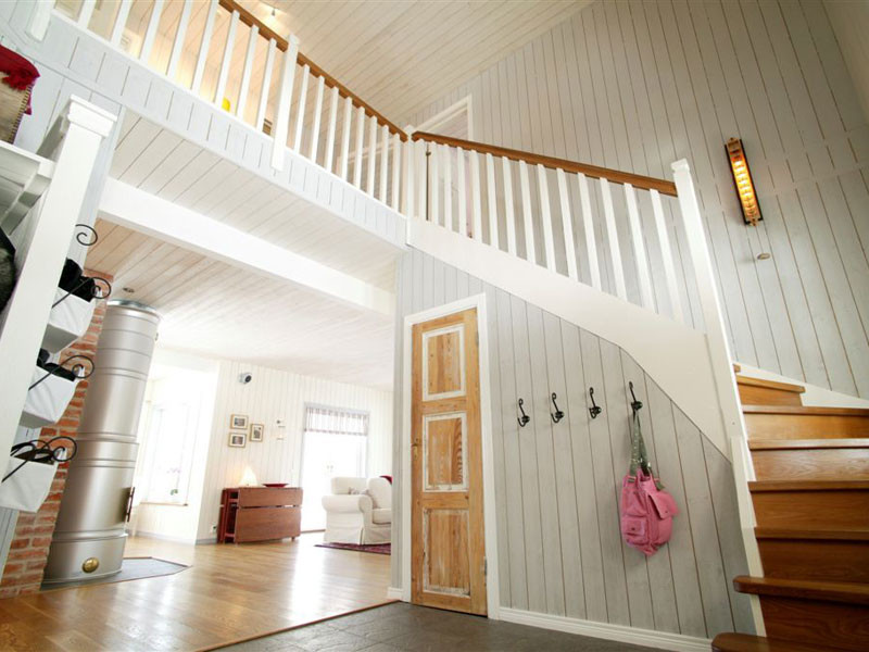Tack för tipsen! Vi ska måla vitt oxå, men ev. något brutet. Oxå mörkt golv i valnöt med breda plank i v-rum och lite Terracotta aktig kliners i kök och hall. Jag har bara sett ett hus med panel på alla innerväggar och de hade använt vanlig råspont och målat vitt med lite brytning. Det var skitsnyggt! Kolla bild nedan (det är ett ungefär likadant hus som vi bygger). Vi har tillgång till gratis hyvlad panel från min svärfar, men funderar på att köpa sågat ändå om det blir snyggare. Problemet är att vi aldrig sett hus med hyvlad panel på så stora ytor så vi har inget att jämföra med.