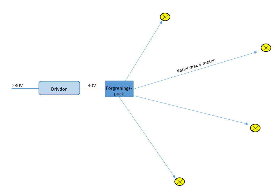 killen på hornbach sa att malmbergs system enbart klarar av att jag sätter 5meter långa kablar från samlingspucken där man dockar I kablarna (dvs inte drivdonet), därefter blir de spänningsfall och inte rätt spänningsmatning till led lampan = problem.