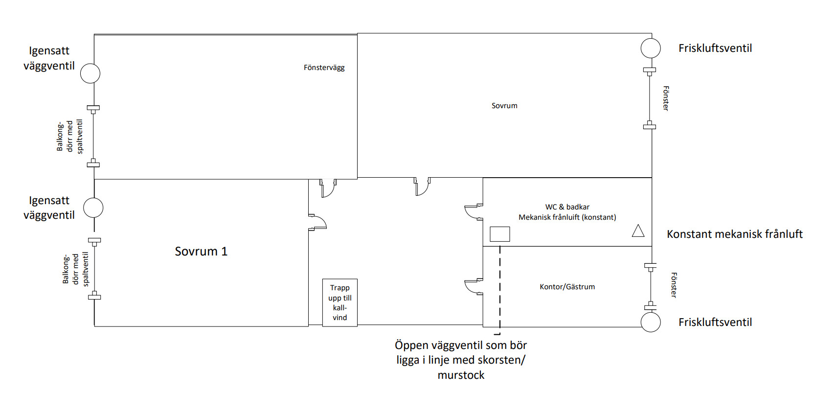 I samband med att den konstanta mekaniska frånluften installerades samt bytefönsterbytet valde man att täta/plugga befintliga väggventiler i två av sovrummen (barnens rum) på övervåningen som har balkong. Se skiss. Dessa är fylla med någon form av isolering/"lin". I stället nyttjar man spaltventilerna i balkongdörrarna. Motiveringen jag hört var för att balansera luftflödena i huset då man installerade den mekaniska frånluften. Som jag förstått det är väggventiler mycket effektivare och att vi istället borde nyttja dessa och istället stänga spaltventilerna? Finns det risk att man istället suger in för mycket fuktig luft? Är det därför man gjort så?