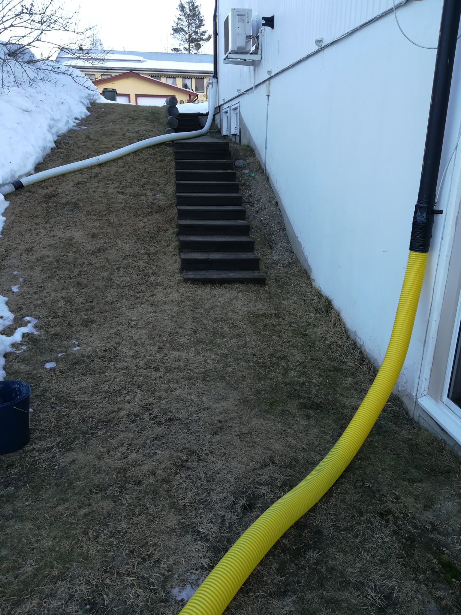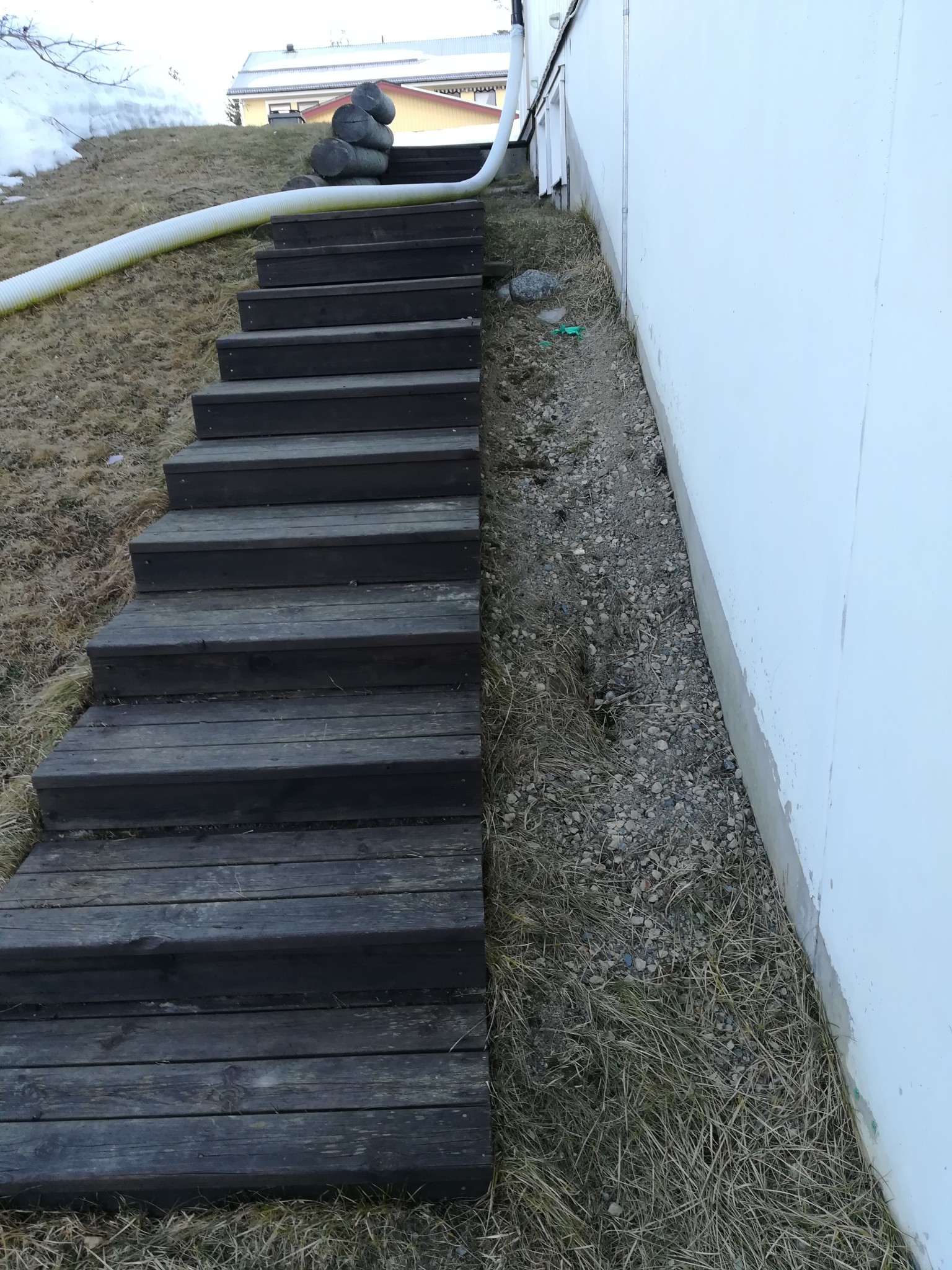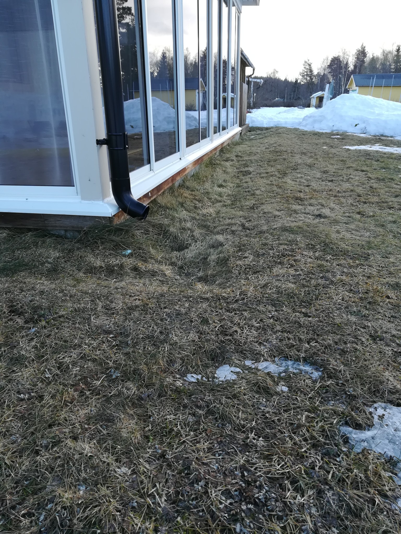 Jag är en ny husägare och behöver eran kunskap och erfarenhet. Snart är våren här och som det syns på bilderna den närmaste halv meter av våran tomt lutar mot grunden. Är det inte något som skulle vara tvärt om? Ska man fylla på den med något? Jord eller grus? Vad säger ni?