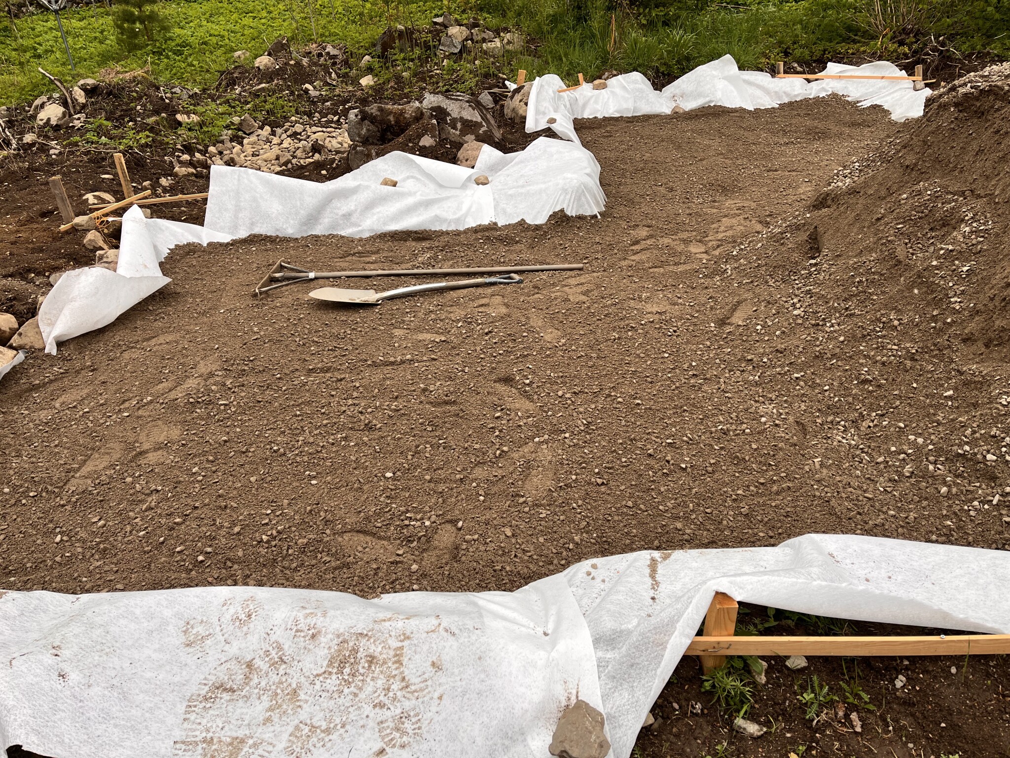 Har grävt upp och lagt markduk i botten, fyllt upp med ca 20cm bärlager som sedan ska paddas, nästa steg är att fylla på med ca 15-20cm makadam.