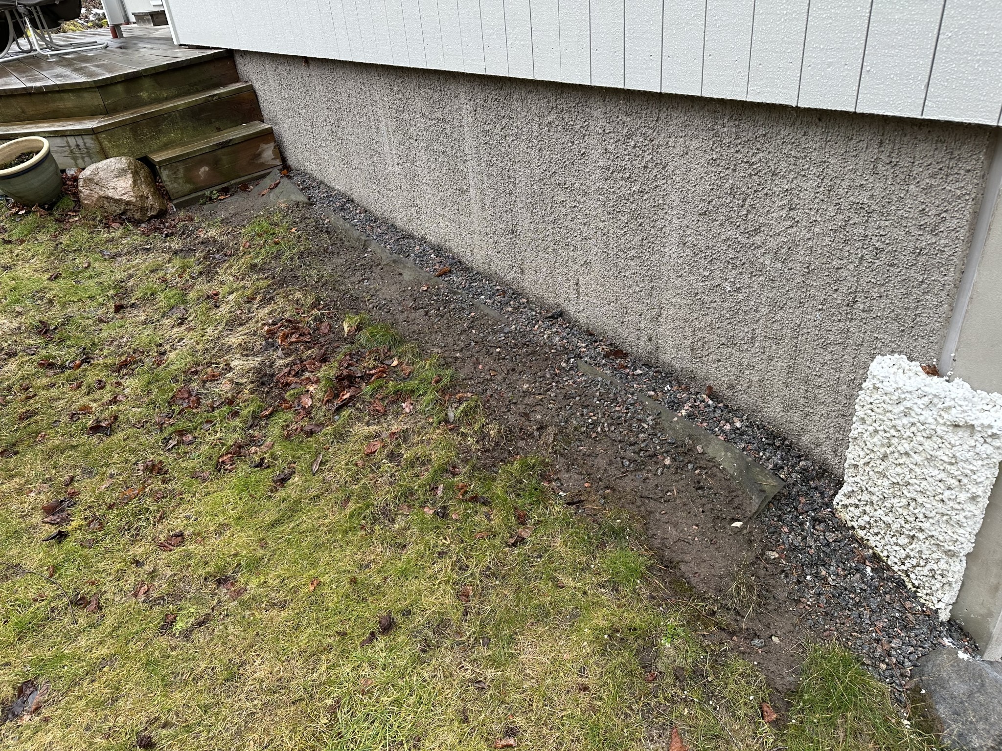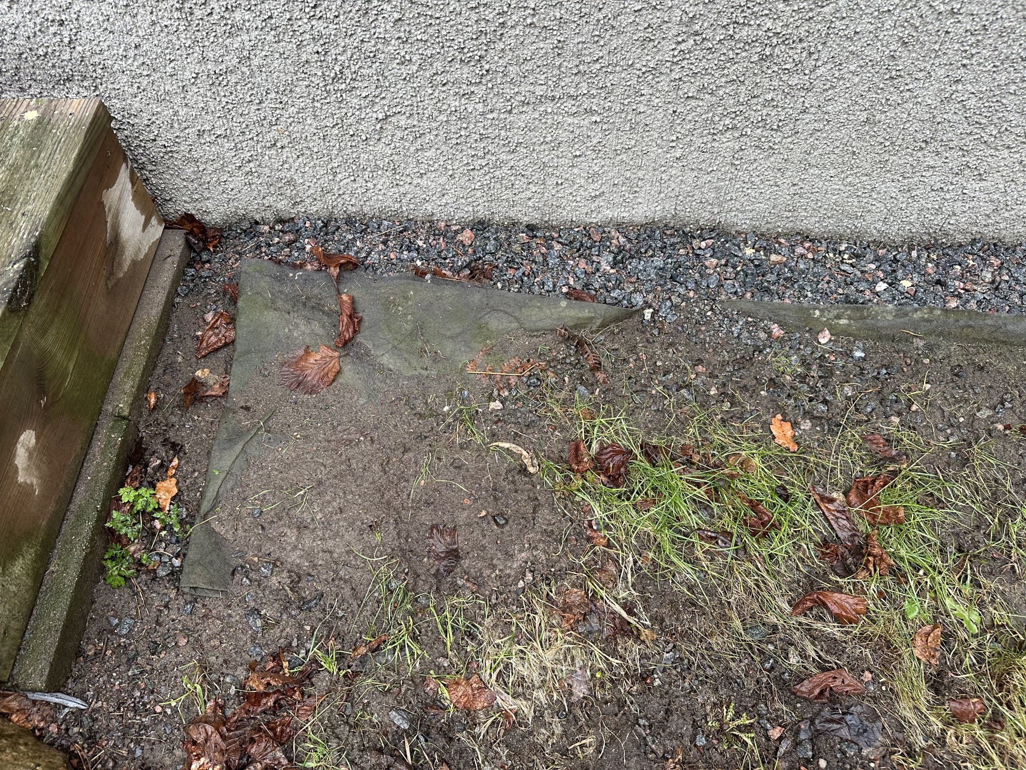 Huset är ett suterränghus, Götenehus, byggt 2008 av förra ägaren. På baksidan har en markduk börjat erodera fram (se bild), och jag trodde att den gick under gräset men nu ser det ut som det är en ”remsa” ca 1-2 dm från fasaden (vid ”källarväggen”) och den ligger där takvatten droppar ned. Vi är såklart måna om vattenavrinning och dränering så vi vill åtgärda och göra det snyggt. Det ser lite ut som en efterkonstruktion.