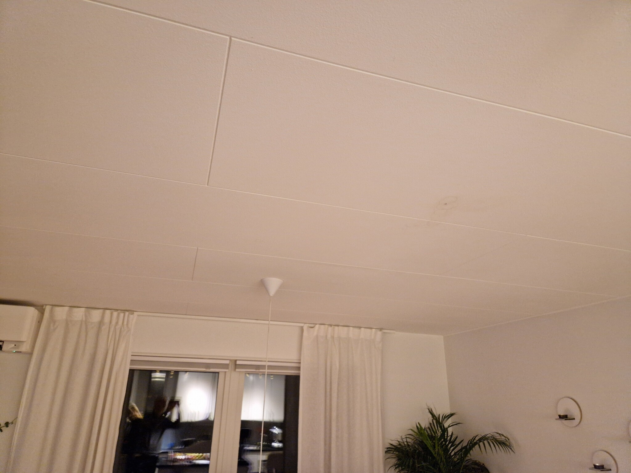 Vi målade om för ett halvår sedan och nu idag fick frun syn på några märkliga fläckar mitt i rummet i taket, blev livrädd att det skulle vara en läcka. Det är dock ett innertak och inte i närheten av några rör. Mätte fukten och det är ingen skillnad vid fläckarna, kikade in från kattvinden och det syns inget konstigt på ovansidan av skivan. Det var inga fläckar där innan, men skulle det kunna bli någon reaktion med något som inte syntes? Någon som har en tanke?