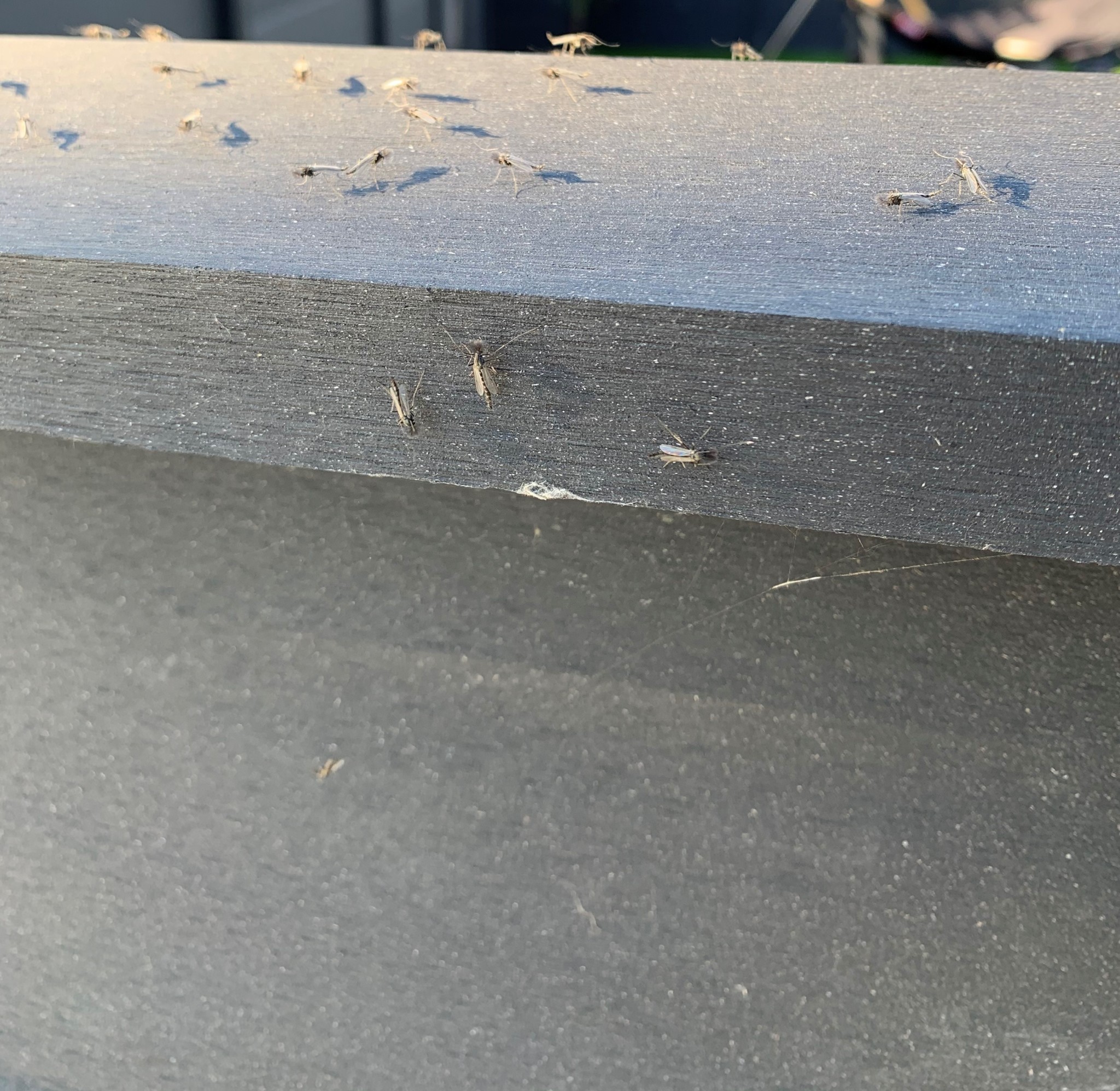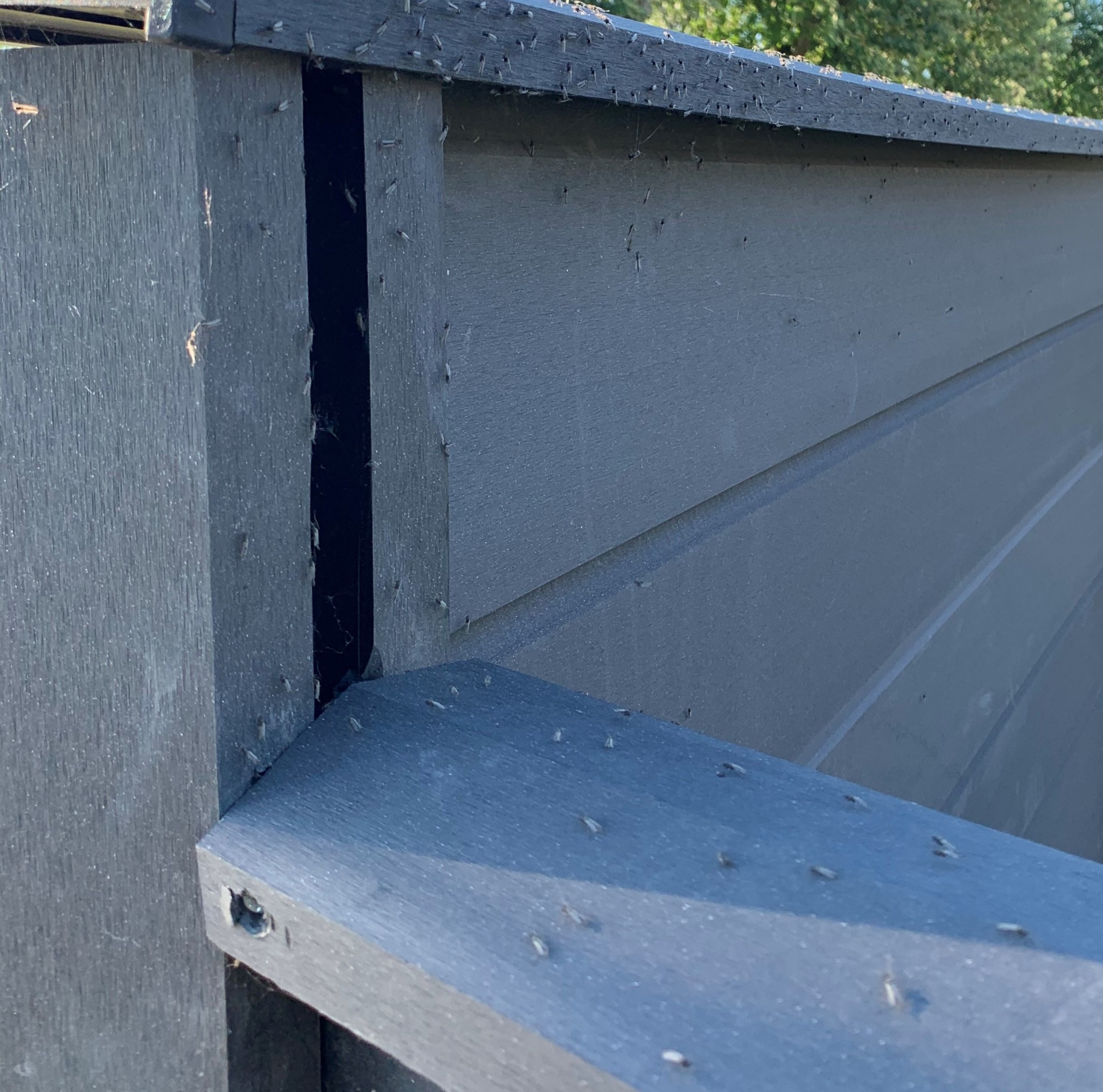 För någon vecka sedan flyttade några nya inneboende in, i form av stora "moln" av en oidentifierad insikt. Se bild. De har de senaste dagarna blivit betydligt fler, och det är nu 4-5 moln i trädgården. De svärmar ca 2 meter över gräset och främst på morgonen, i närheten av eller mitt i skuggläge. Sen försvinner de men jag har sett att de uppehåller sig i skuggan bakom garaget istället. Vi har försökt spruta vatten på dem i 10 minuter och då satte de sig på staket o torkade upp, sen svärmade de igen.