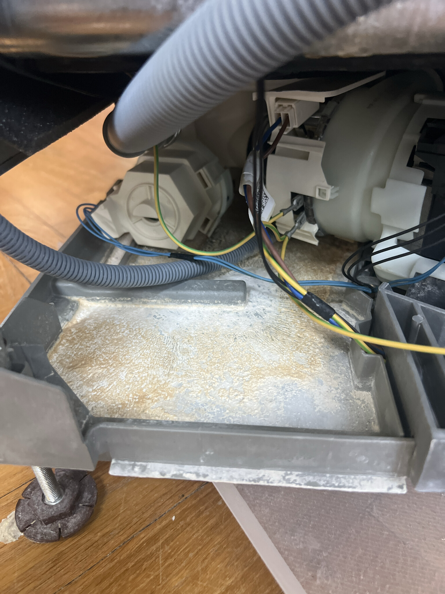 Tack! Det är i20 fel som ljuder och det beror troligen på att vattnet som runnit på sidan har skapat den vita utan som nu påverkar någon sensor som gör att maskinen inte tillåter tömning. Inget vatten åker in i maskinen utan när man slår på den så kör den i 5 min utan vatten och sedan ljuder i20 felet. Någon som vet hur man kan fixa sensorn? Koppla ur den/städa rent runt den? Har kikat på massor av flimmer som beskriver andra typer av orsaker till i20