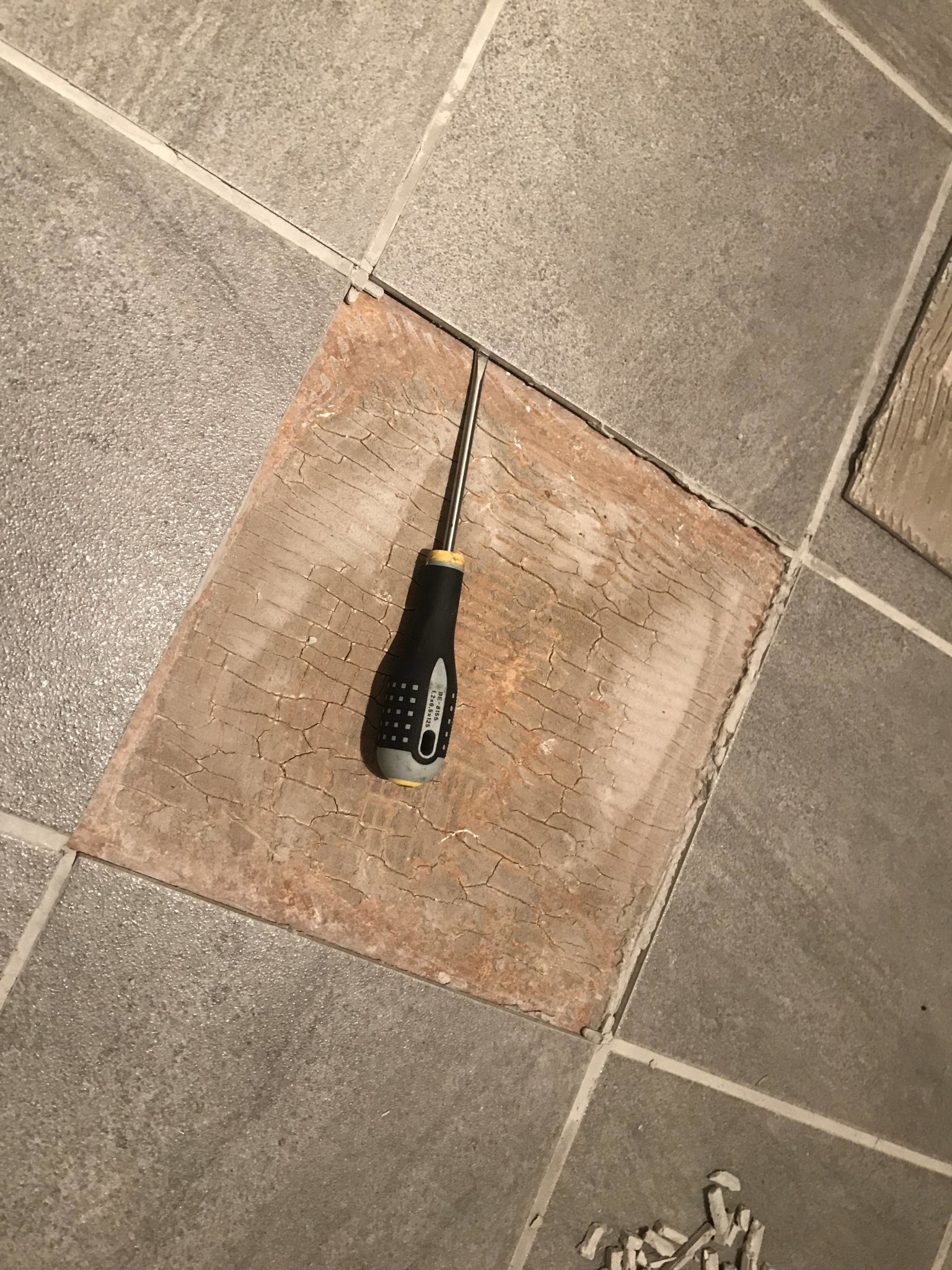 I hallen ligger det idag klinkers direkt ovanpå en masonitskiva (tror jag, ser ut som något sånt iaf) och det fungerar som ni förstår väldigt dåligt. Fogarna spricker och sådär.