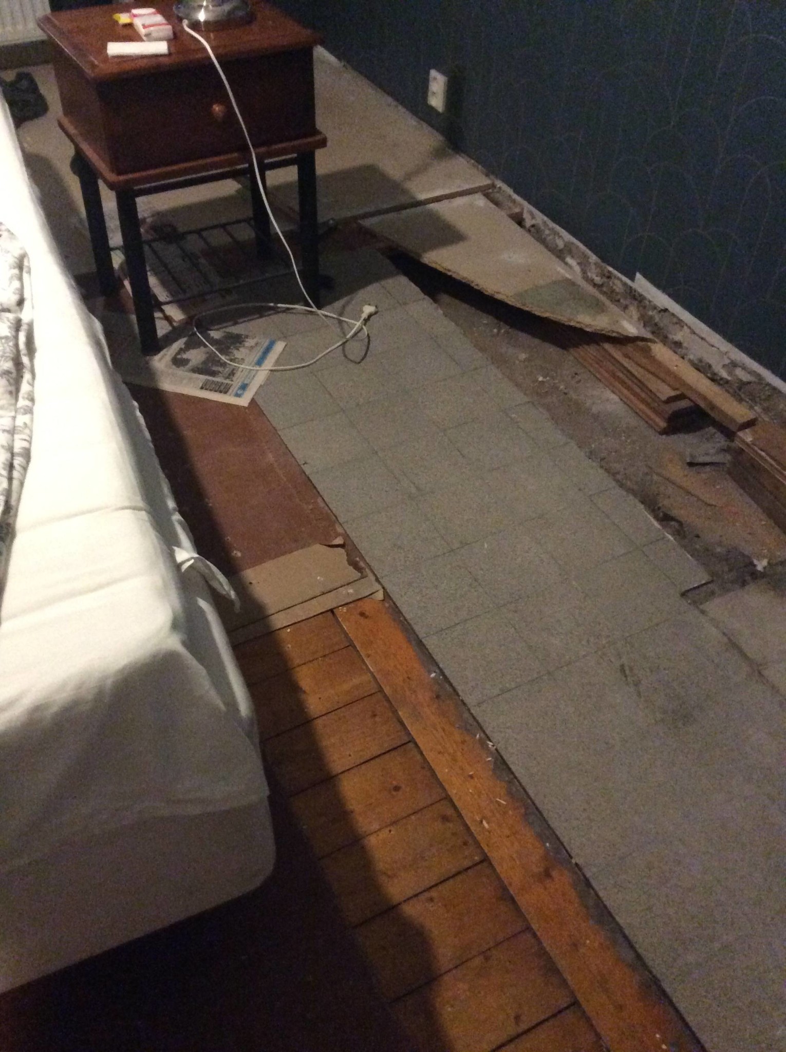 Jag har precis rivit ut korkimitationsplastmatta och spånskivor från vårt sovrumsgolv och möts då av det som bilden visar. Ett gammalt köksgolv med delvis furubrädor och delvis betong och klinker. Min tanke är att lägga ett nytt golv tvärs på det gamla. Vill helst inte lägga nya spånskivor för att det bygger på för mycket. Kan man lägga ett nytt 15 mm furugolv som man skruvar mot brädorna och limmar där det är sten under? Om inte, har ni några andra lösningar på problemet?
