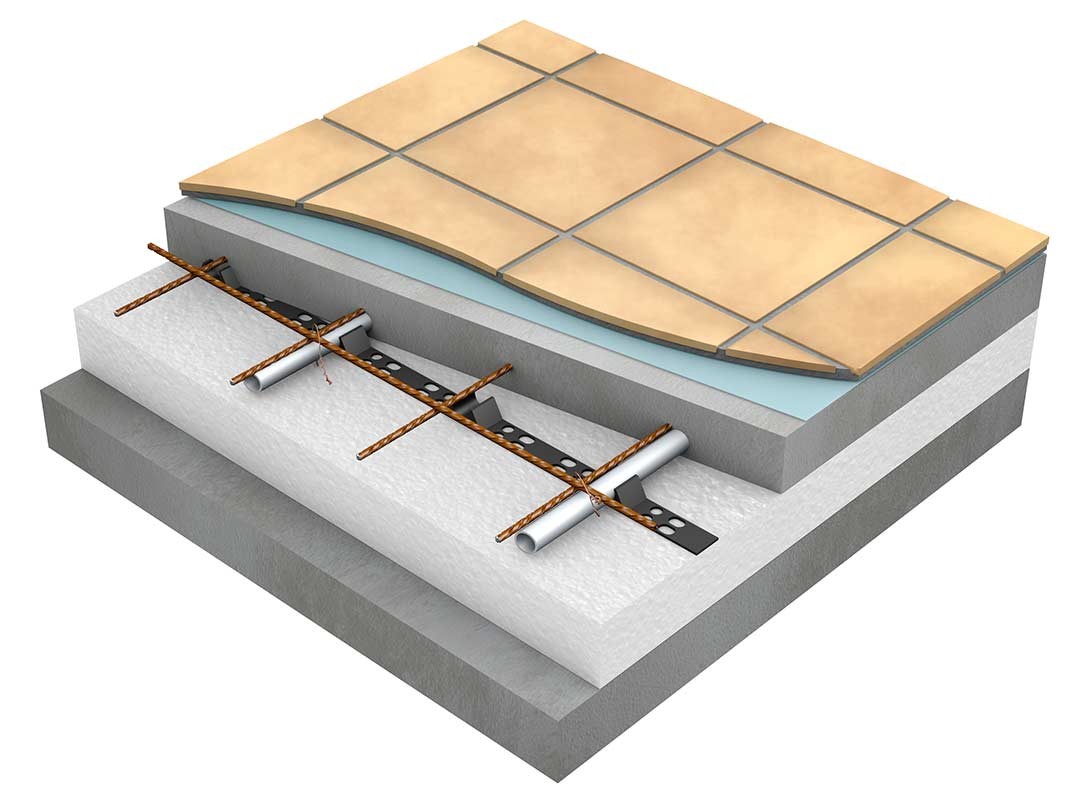 För EPS är det inte ovanligt att man lägger nätet direkt på underlaget och sedan när man fäst armeringsmattan så fäster man slangen i denna. I pricip blir det ju en underkantsarmering då en överliggande flytspackelkaka eller slipsats kommer greppa nätet och suga in någon milimeter i EPSCementen.