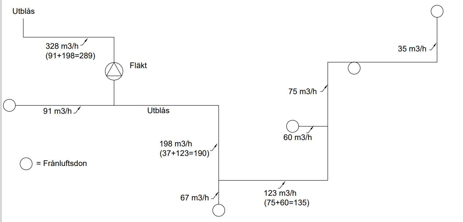 Okej jag behöver kanske läsa på lite om ventilation. Jag tänker annars att om jag har två olika flöden på 75+60 m3 som går ihop i en större ledning så måste denna luft ta vägen ut via punkten 123 och i teorin bli exakt samma (om alla 3 mätpunkter hade varit optimalt placerade). Eventuella tryckfall etc i huvudledning borde sådana fall även påverka flödena 60 och 75. Luften före kan ju inte bara försvinna. Som i mitt fall så försvinner 12m3 vilket inte borde i ske vid frånluft.H Håbbe01 skrev:
