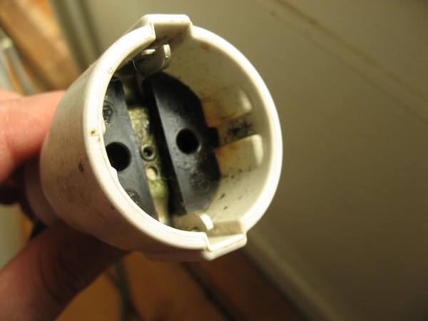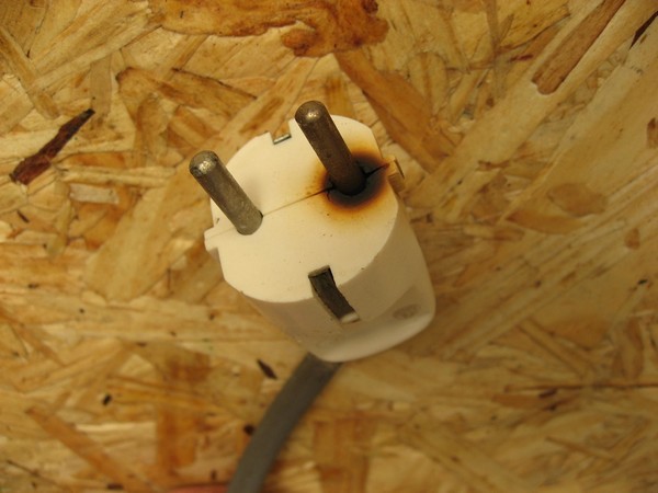 Hur som helst. Bakom kopplingsdosan fanns det spänning. Kopplade isär skarvkopplingen och testade honkontakten. Spänning där med. Kopplade ihop skarvkontakten och mätte i uttaget. Pendlade mellan 40-50 volt. Drog ut skarvkontakten igen för att plocka ner hela uttaget och se vad som var fel. Fick då syn på hankontakten som genom ett mindre under inte hade börjat brinna utan "bara" pyrt. Kom då på att det har luktat väldigt illa emellanåt men ingen av oss gjorde kopplingen till pyrande plast. Det luktade mer gammal fisk eller dåligt avlopp. Då vi har problem med avloppet i köket som ligger precis intill uttaget tog vi för givet att det var detta som luktade.