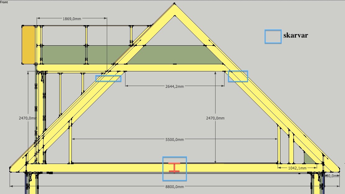 Lättast för mig känns som att montera ihop dem helt på backen och lyfta upp dem hela, men hur skall jag trä in dom i balken? Om jag inte monterar ihop dem innan så är det väldigt högt upp som spetsen skall fästas då jag skall ha 45graders lutning på taket.