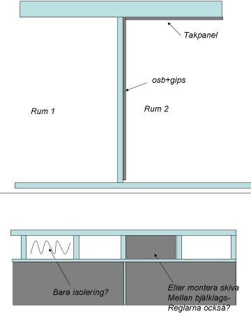 Mycket "Mellan" här..men jag håller på och sätter OSB-skivorna på mellanväggarna och inser att de täta fina väggarna mellan rummen får en massa gapande hål uppe i kanten i mellanrummen mellan bjälklagsreglarna till loftet...ska visserligen sätta isolering mellan reglarna och sen sätta takpanel som ansluter till väggarna och tätas med fog osv..men det känns som att det blir ganska klent ljudskydd? Hur brukar man göra? Funderar på om jag ska smäcka dit en osb-skiva/gips i gapet för att säkerställa ljuddämpning?