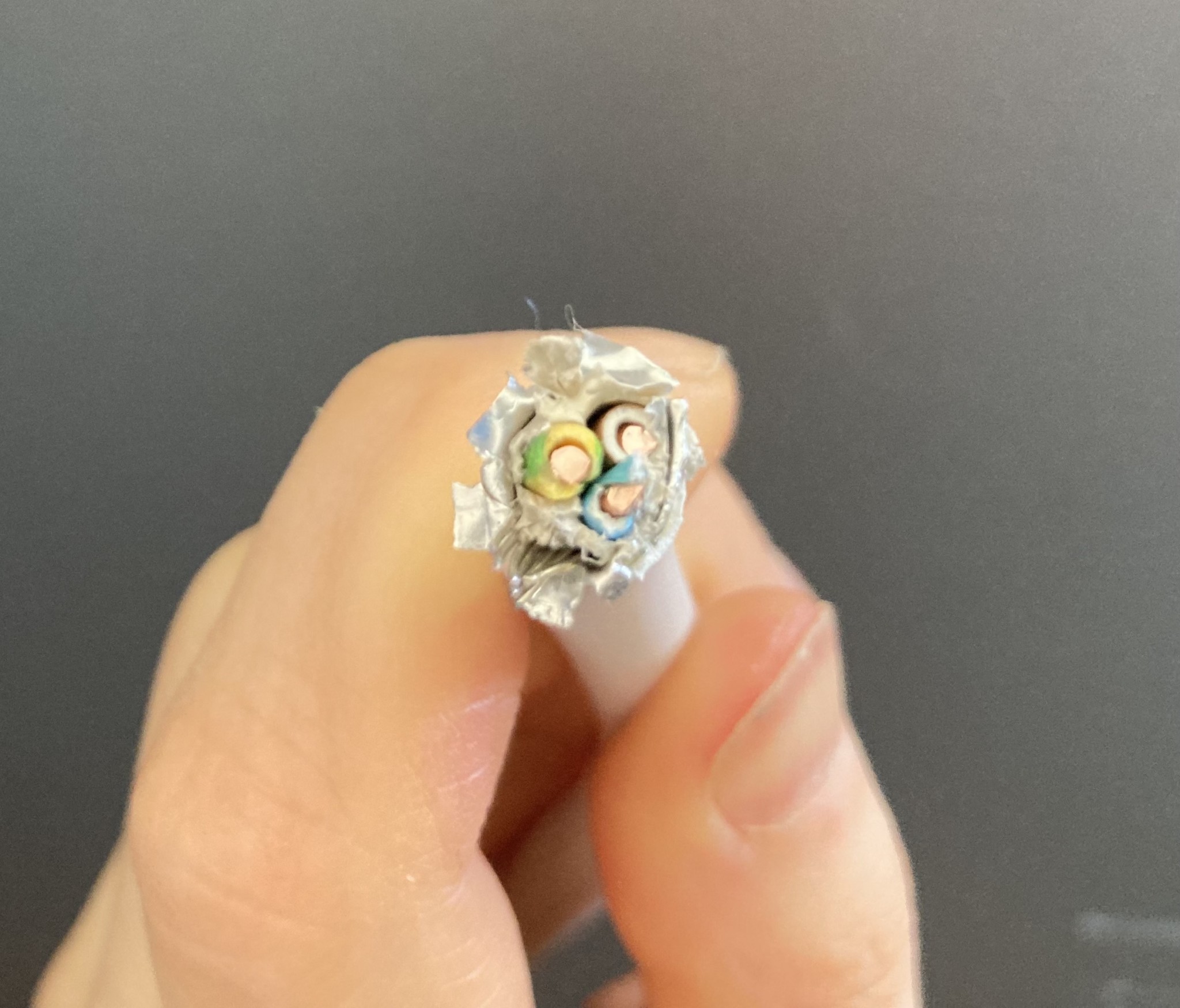 Har ni förslag på verktyg för att skala den här kabeln? (Eller är det bara att jag inte kan rätt teknik?) Kabeln var för lång och låg inknölad bakom kylskåpet, jag ska korta av den och placera uttaget på ett bättre ställe.
