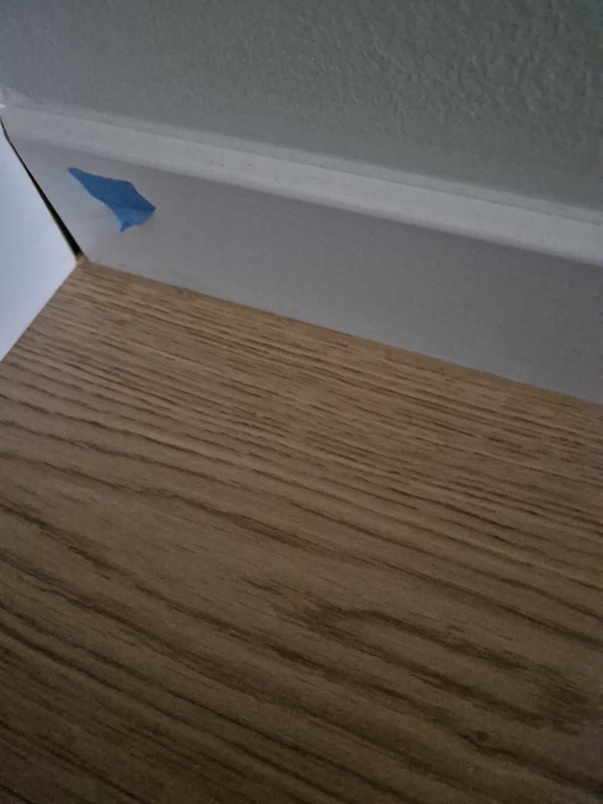 När jag tittat på det igen på plats, inser jag att det nog inte går att lägga om bara vardagsrumsdelen, utan även köksgolvet måste läggas om? Väggarna är redan färdigmålade, täcksidor i köket är på plats, vitvaror, rubbet. Fullt med möbler till bredden. Jag antar att väggarna kommer behöva målas om ifall man gör åverkan på dom och tar bort socklarna?