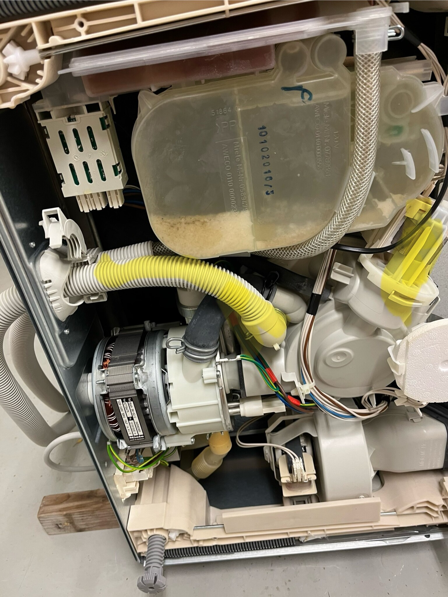 Japp, då var väl undersökningen klar. Körde ett program i garaget. Bottenplattan borttagen så man kommer åt avloppspumpen under drift. Den var ju helt tom på vatten eftersom jag haft den på sidan mm så det var inga problem för den att starta programmet. Den gick även vidare efter grovsköljning till själva tvättfasen. När den skulle tömma inför sköljningen hörde jag att avloppspumpen var elektriskt tillslagen men att den inte roterade. Tog då en större skruvmejsel och knackade på den och då kom den igång. Alla elektriska anslutningar ser ok ut så det är nog så enkelt att pumpen är sliten. Ny beställd på Mieles hemsida.