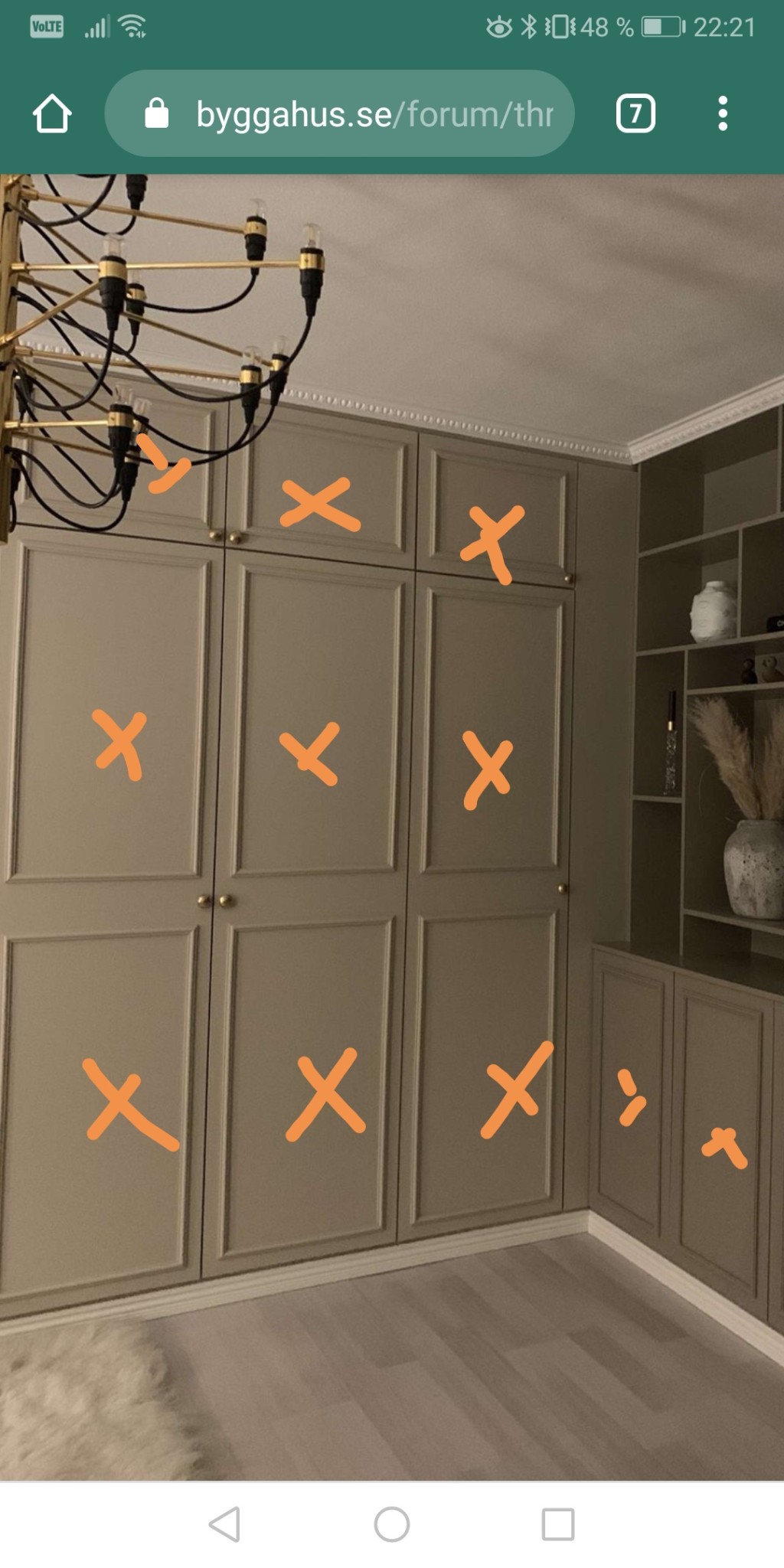[bild] Här är garderoben som blev 35 djup, och varje dörr är ungefär 55cm breda, byggde som 4 stommar, 2 stora garderobsstommar och 2 mindre för överskåpen, och la ihop allt mot väggen och skruvade ihop.