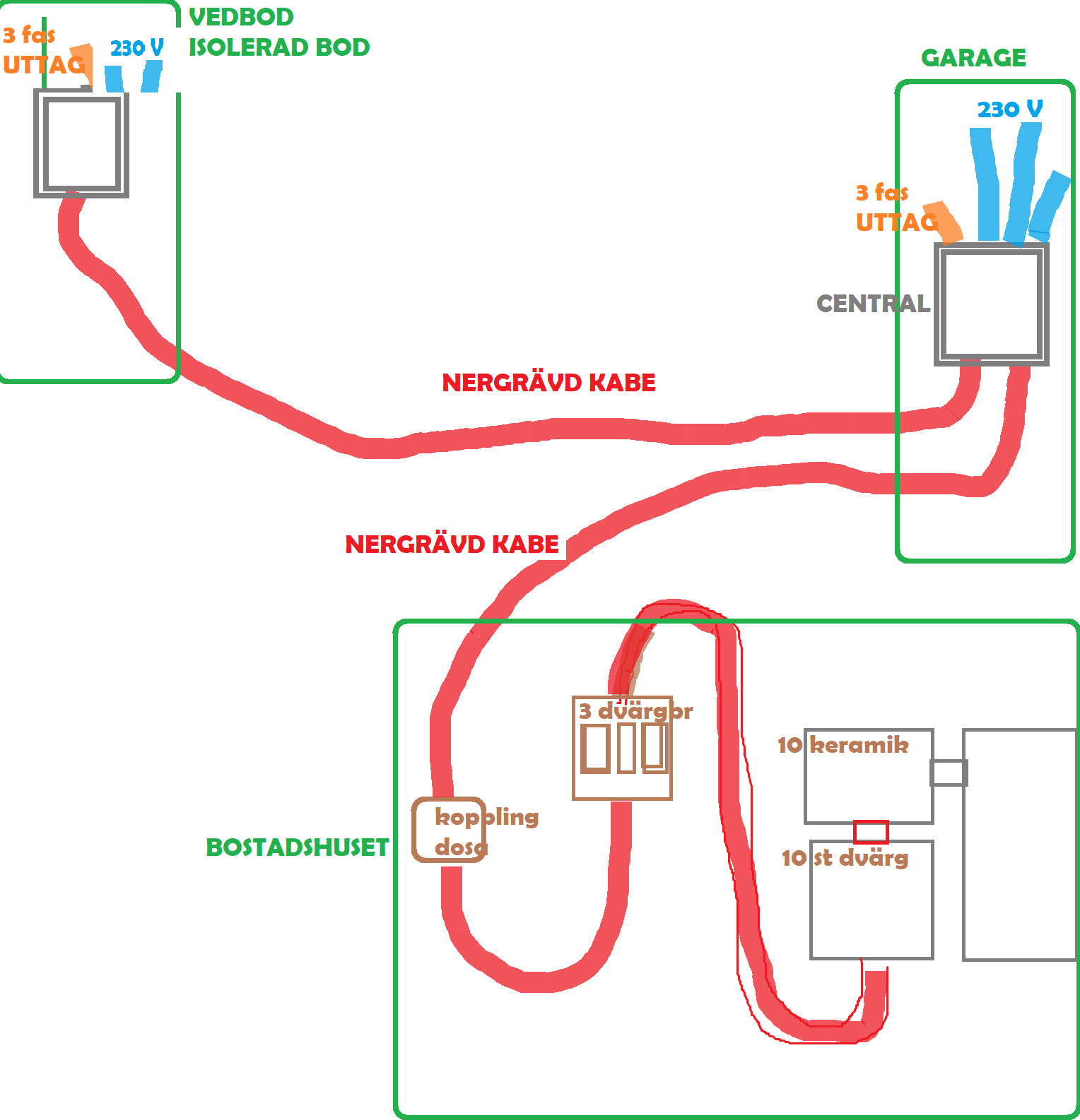Jag har några frågor som gäller min utomhus-EL. Bifogar en ful ritning.