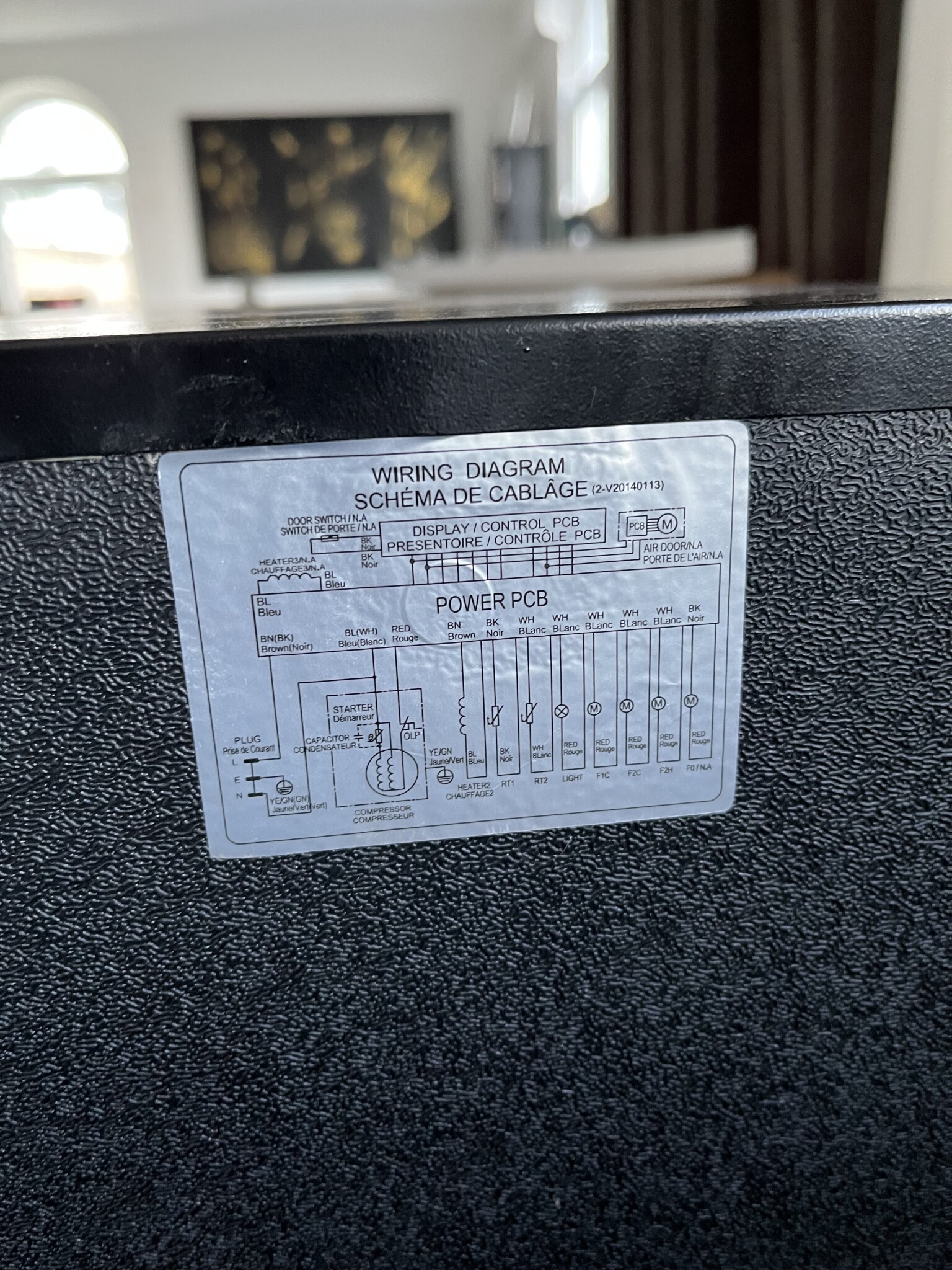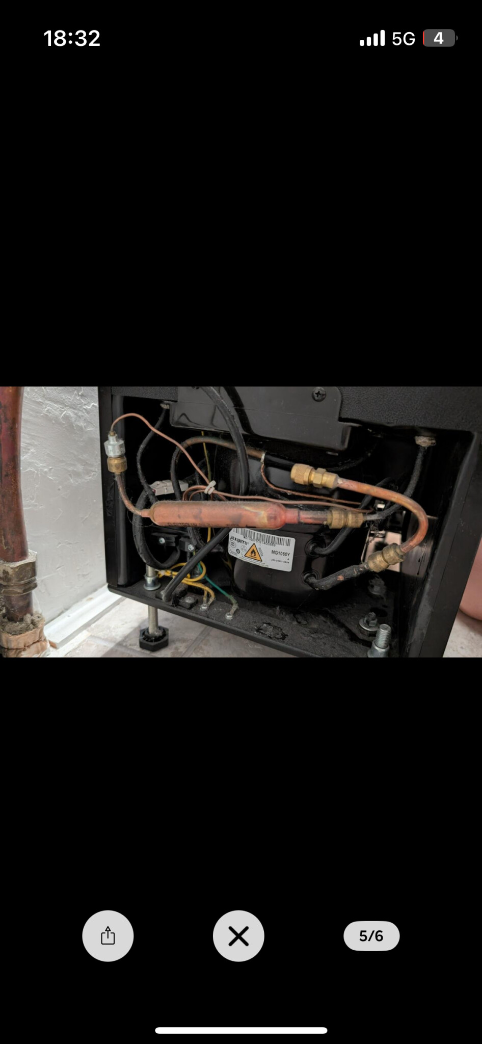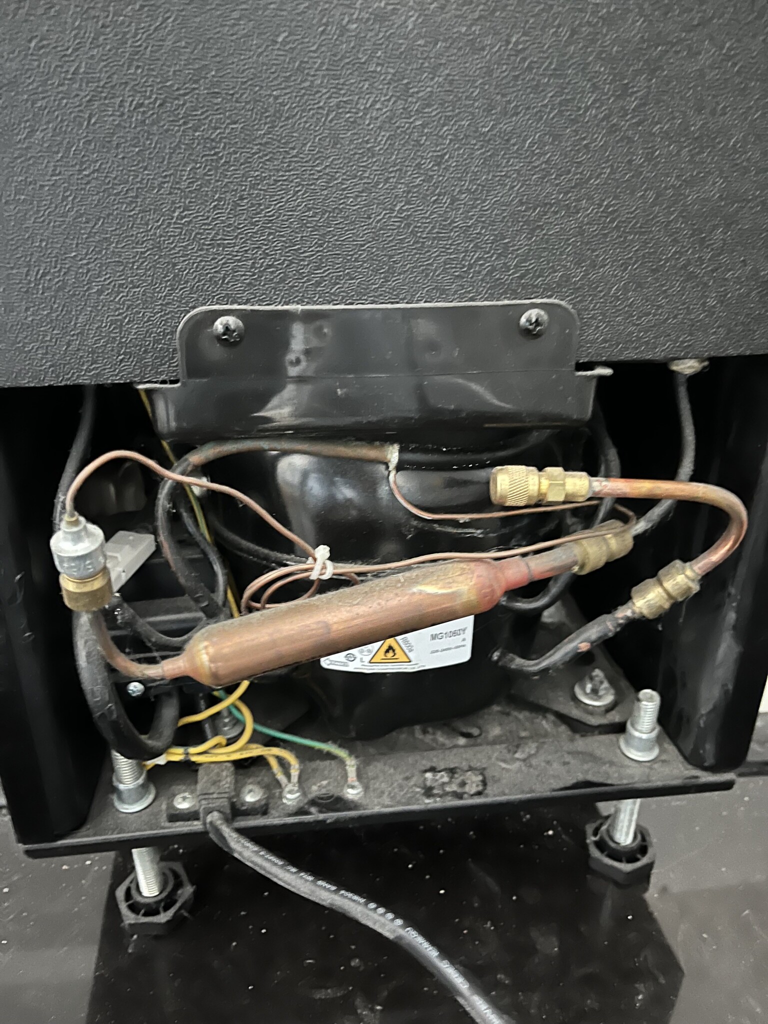 - kondensvattentråget har du troligen ovanför kompressorn - det svarta som sitter med två skruvar fäst i bakstycket, troligen går utloppet från kompressorn (hetgasen) med rörledning upp i tråget, ett par slingvarv i tråget och sedan ut igen mot kondensorn. - man använder den varma hetgasen från kompressorn för att ånga upp kondensvattnet, och det kan finnas risk att det är den slingan som har hål i sig om maskinen saknar köldmedel, är det spår av olja i kondensvattentråget och på slingorna där så är det indikation på köldmedieläcka.