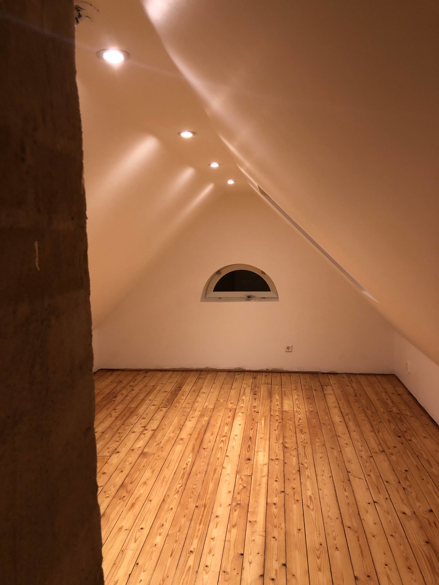 Nu är allt klart, utom golvlister. Är nöjd med hur det blev och den rundade övergången mellan snedvägg och tak blev rätt fin