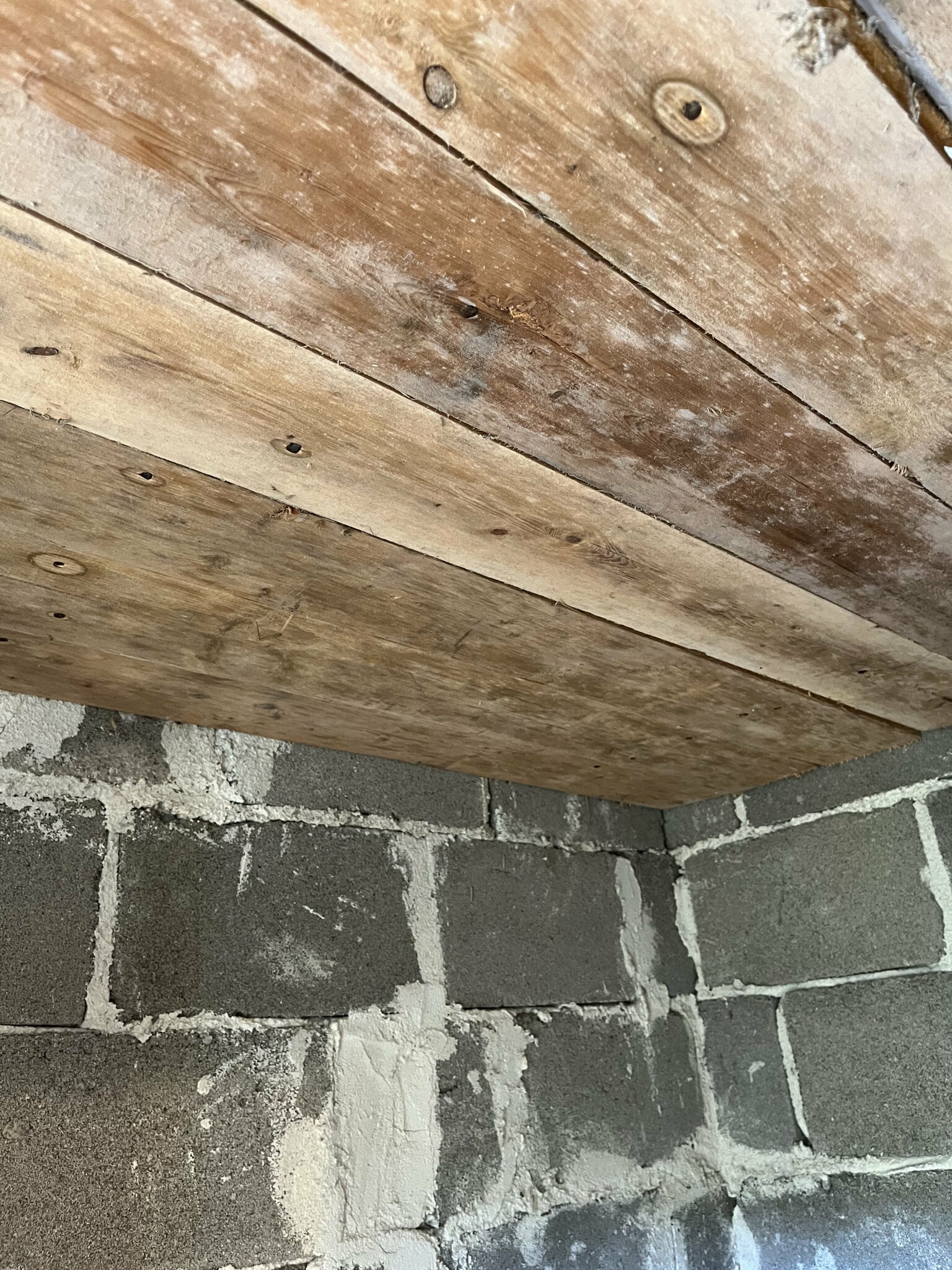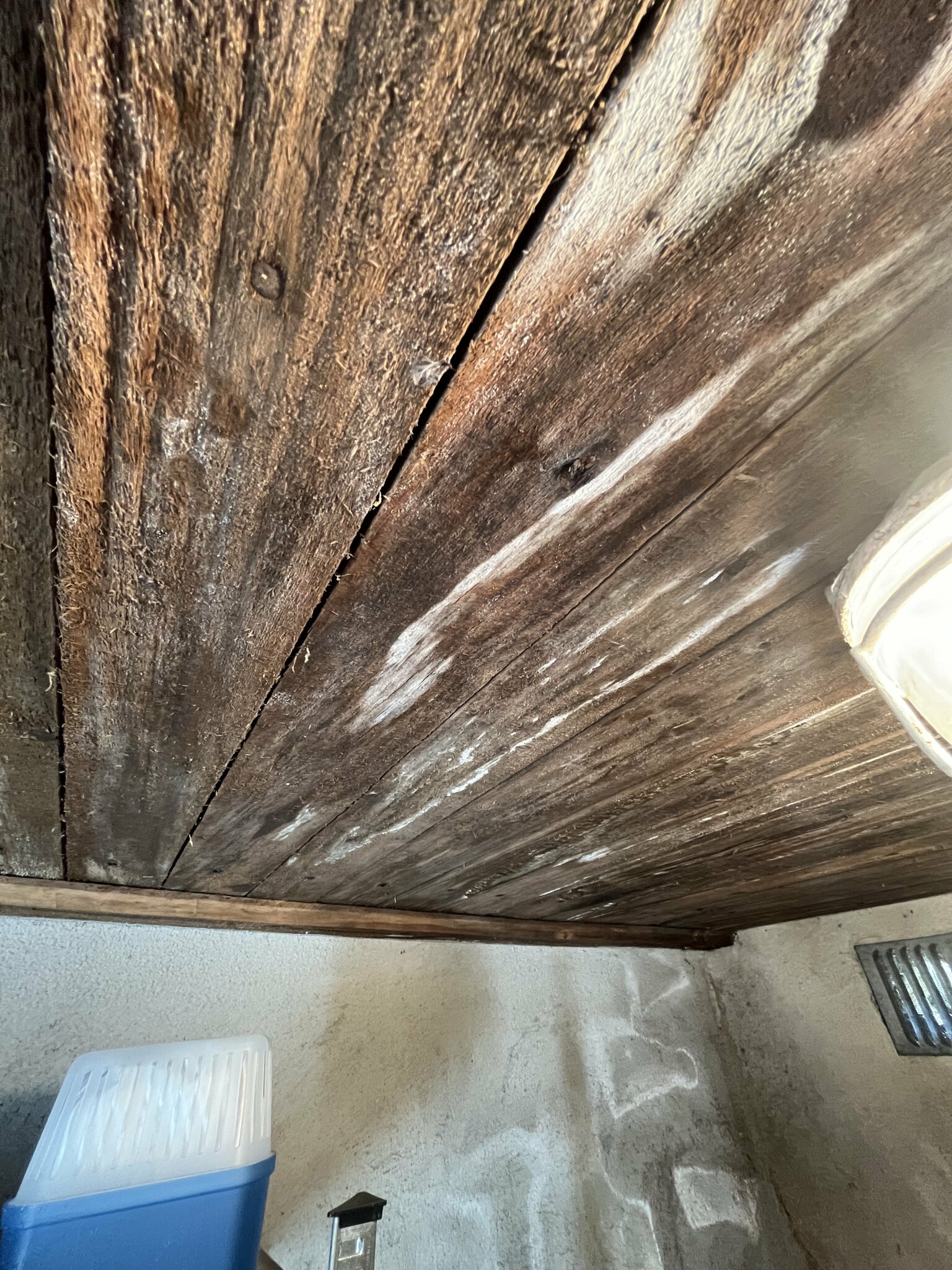 Under sommaren midsommar till mitten av september blir det ganska fuktigt i matkällaren och det kondenserar mot innertaket som är av brädor, lite mögelpåvåxt och brädorna är ganska dåliga nu efter snart 80 år. Under brädorna sitter det tjärpapp och sedan Är det 20cm spånissolering och sedan köksgolvet.