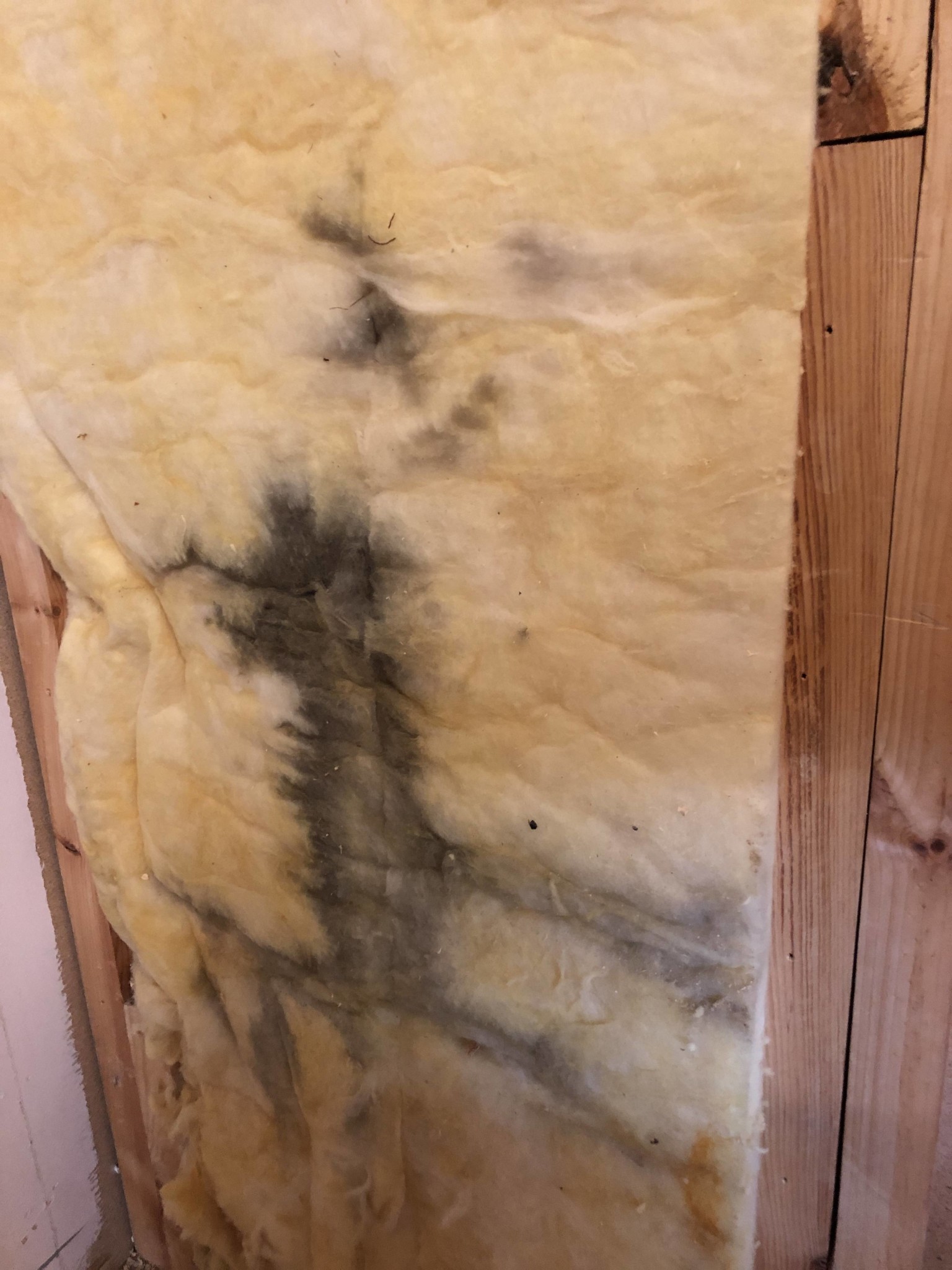 1. Missfärgad isolering punktvis, i en vägg bakom kyl/frys.