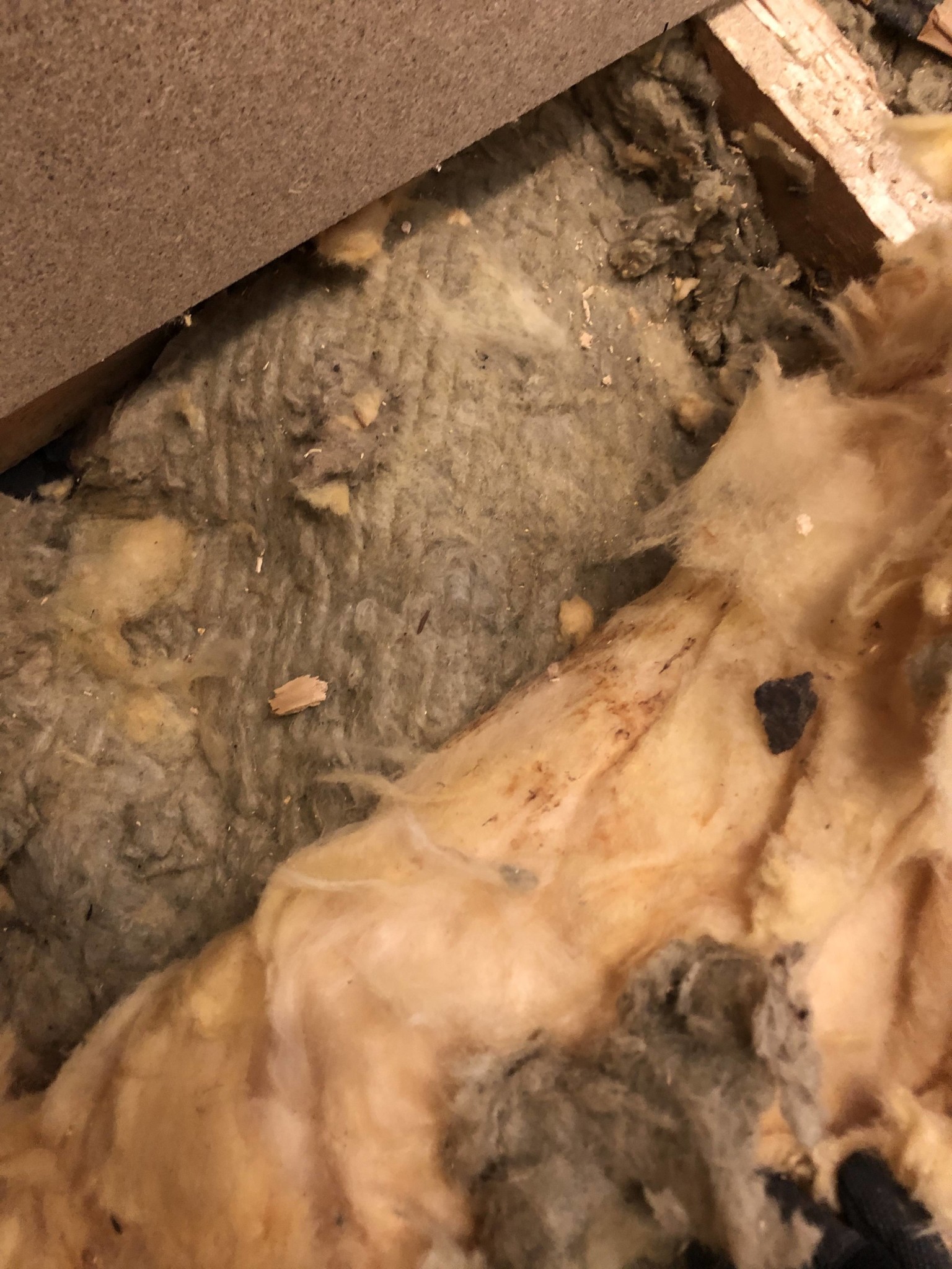 2. Olikfärgad isoleringen i bjälklaget. Tycks vara som två olika lager, varav det undre är mörkfärgat.
