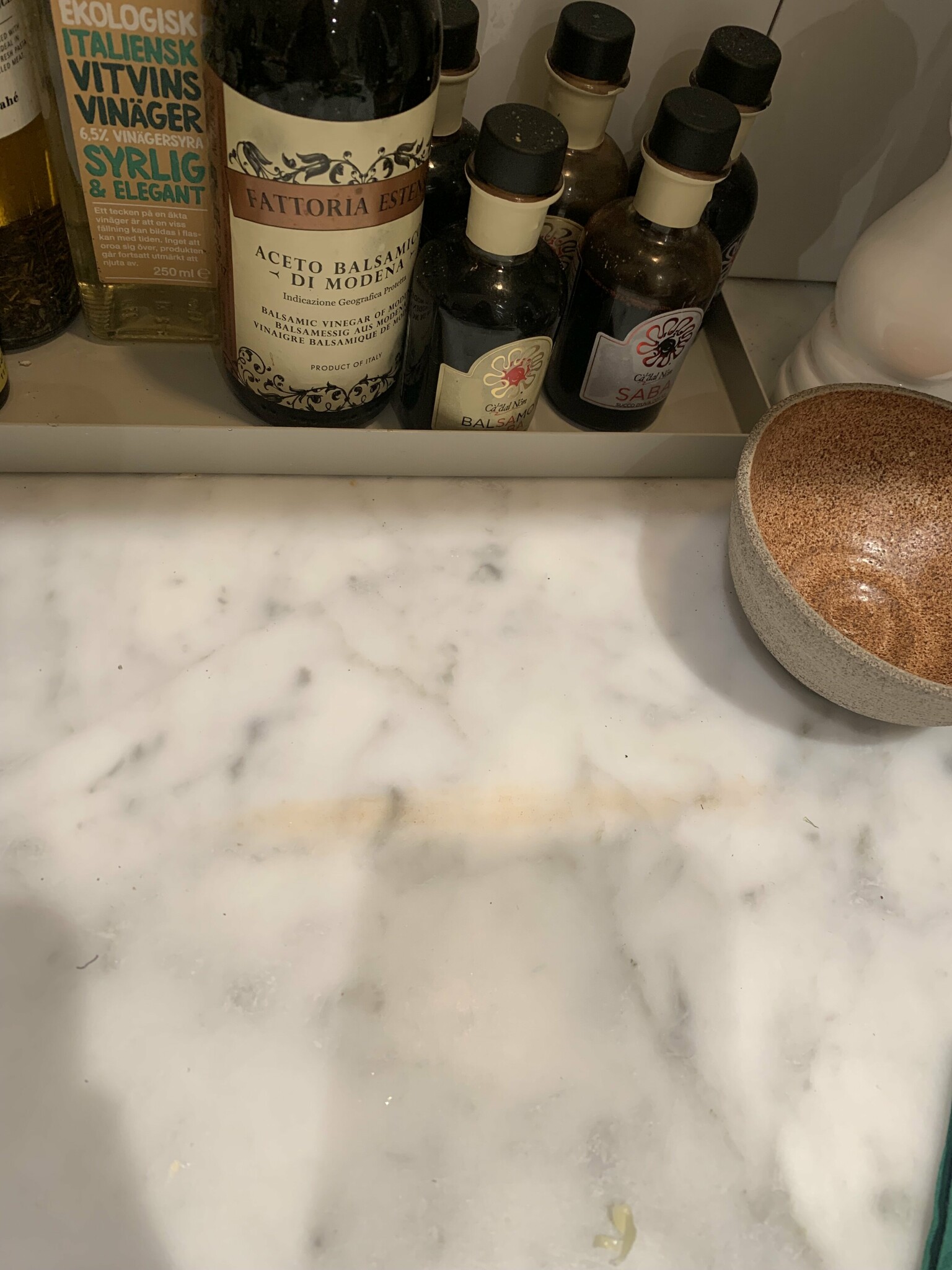 Nej, det vet jag inte. Vet inte hur marmor reagerar med syran jag skulle vara ytterst försiktig. Marmor är hårt men ändå poröst, risken är att man får någonting typ av reaktion mellan syran och kalk/marmor som går längre ner i skivan. Skulle prata med ett stenhuggeri och/eller där de säljer marmorskivor vad de kan rekommendera.J JB80 skrev: