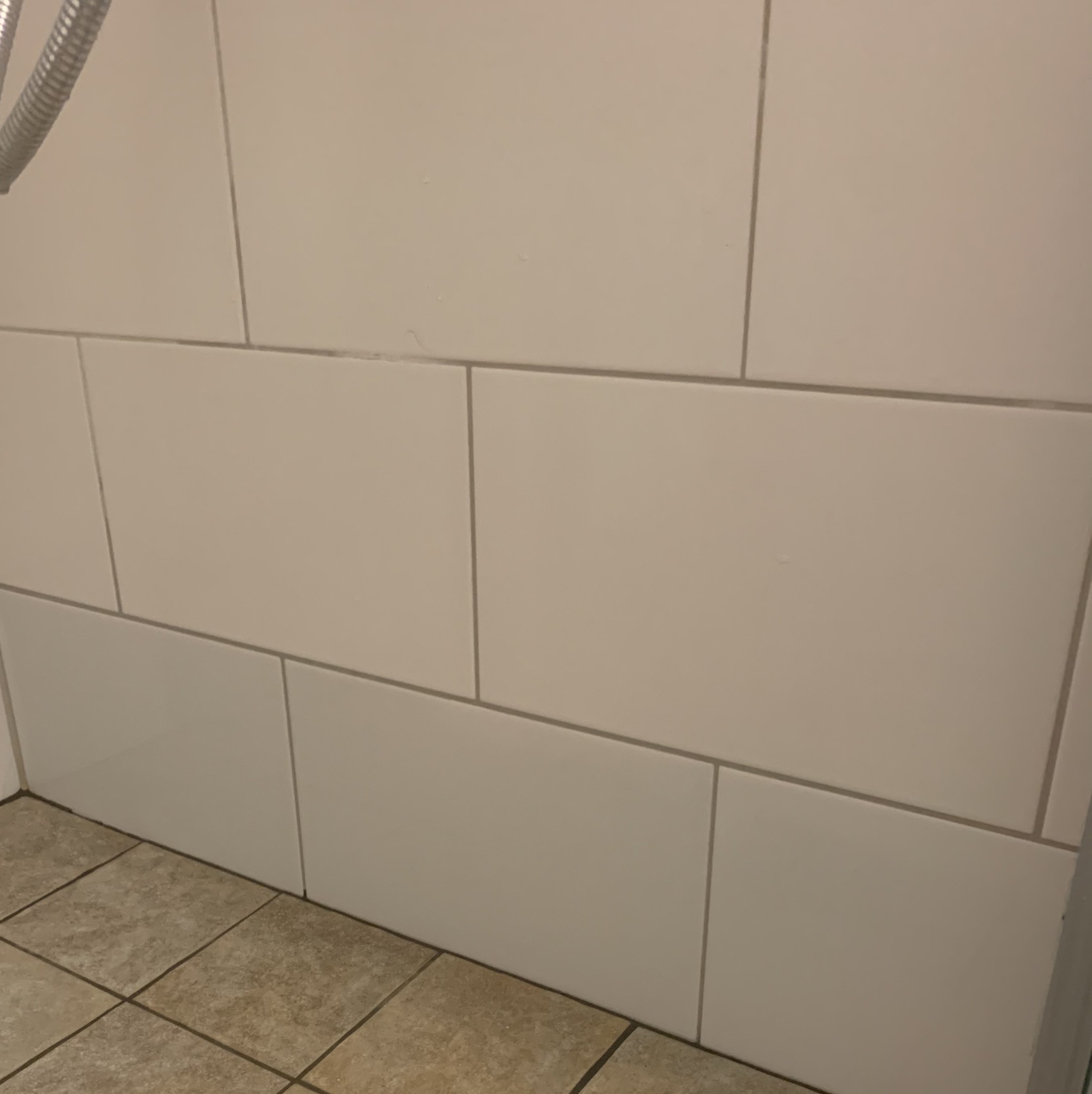 Det är endast på kakelplattorna längst ner i duschen, resterande plattor i badrummet är vita men dessa är mer grå. Det är som en jämn infärgning inte fläckiga utan mer som om plattorna har en annan färg