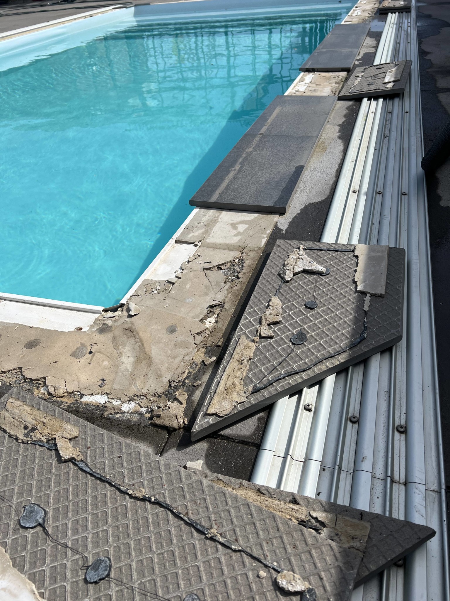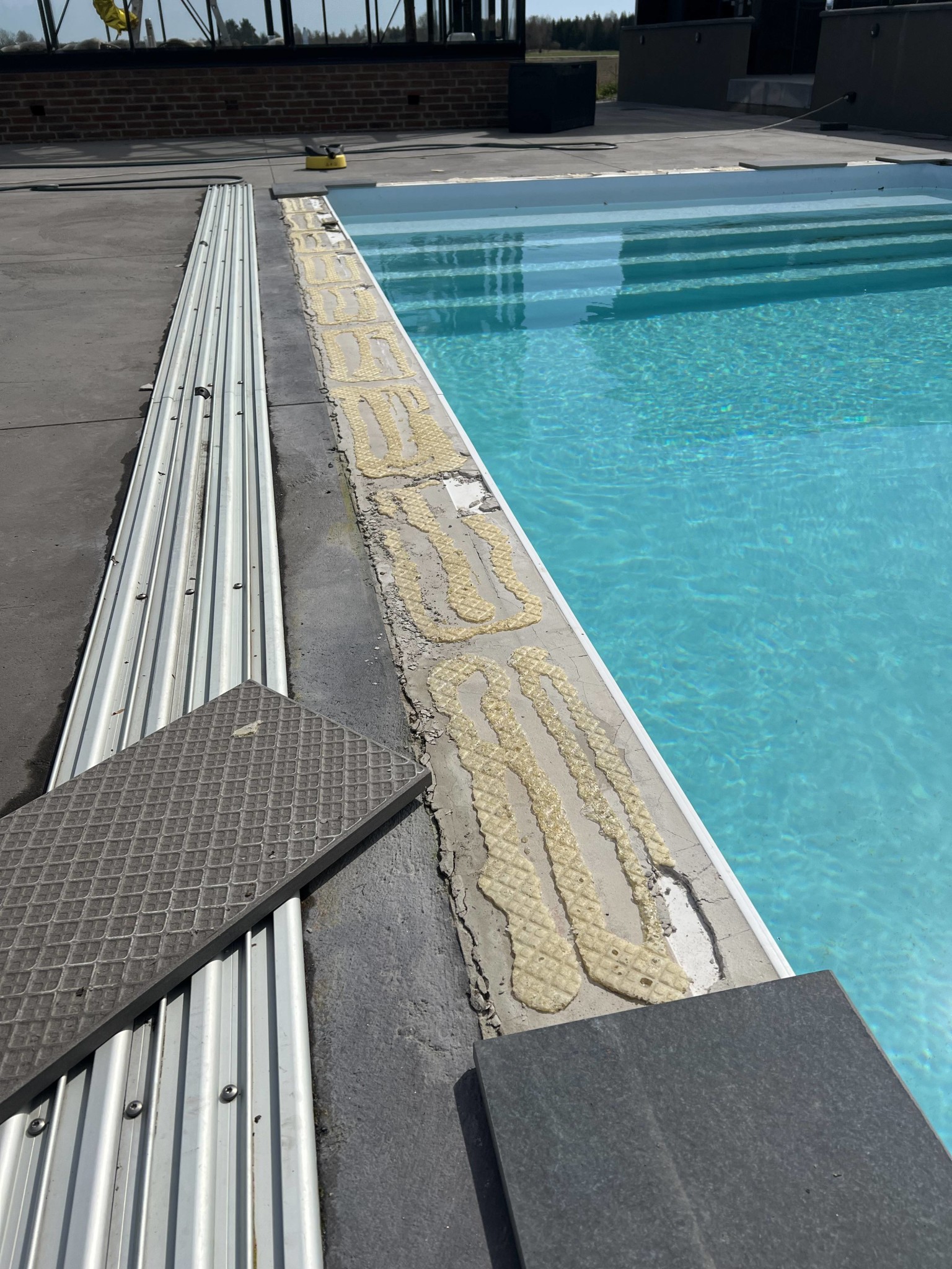 Snäpplisten i plast (den vita ut mot poolen) visste jag om att den inte skulle håll emot något, men jag fyllde den med spackel för att det inte skulle stå vatten där som ev skulle frysa vintertid och spräcka stenen.