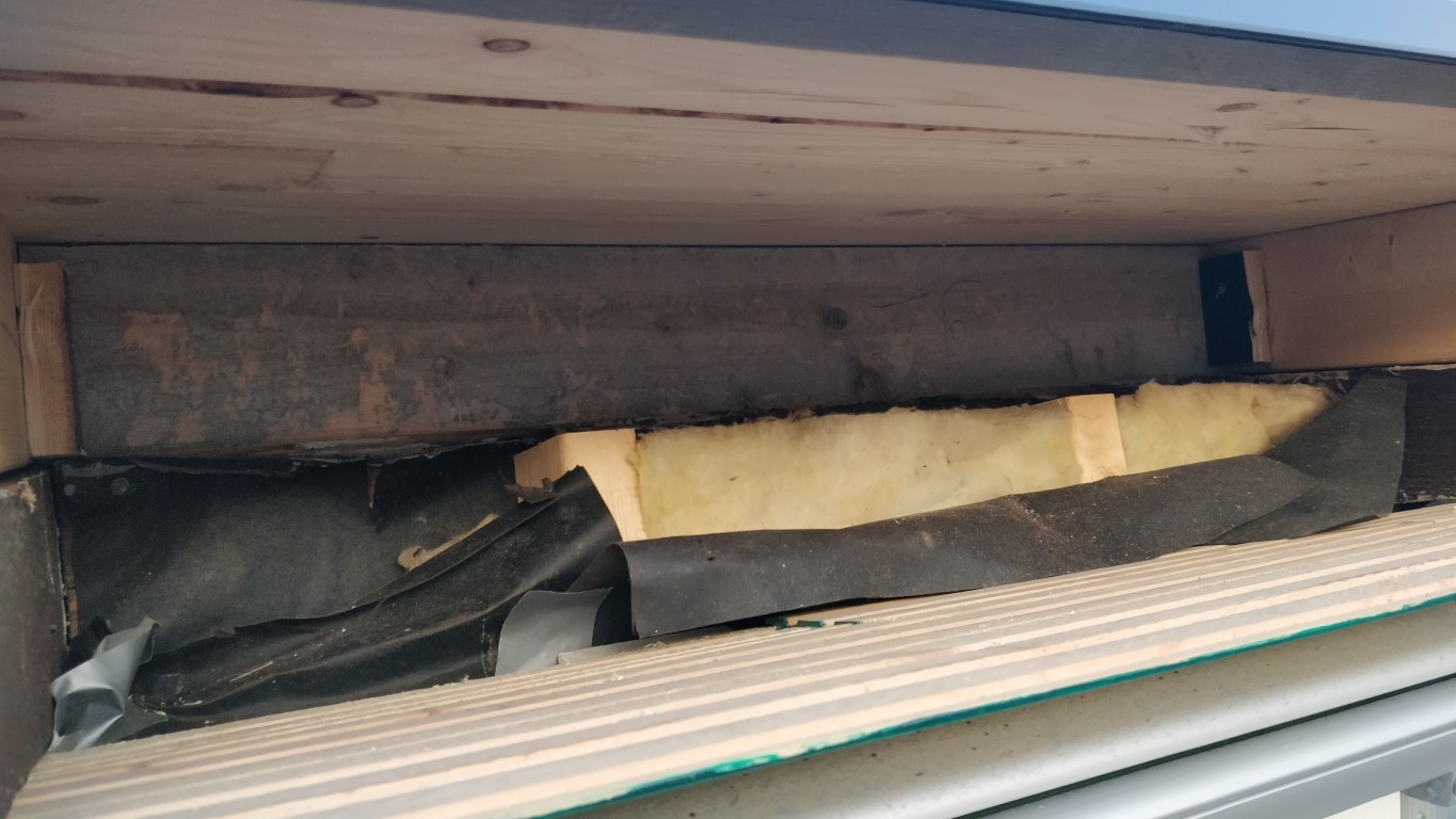 Hade jag gjort det stälv hade jag lagt en rand isolering och sedan tejpat ny vindpapp/duk mot befintlig som kommer nerifrån och dragit upp mot masoniten som sitter bakom brädan och på så sätt skapat både en obruten vindskyddad isolering och en luftspalt som går ända ut.