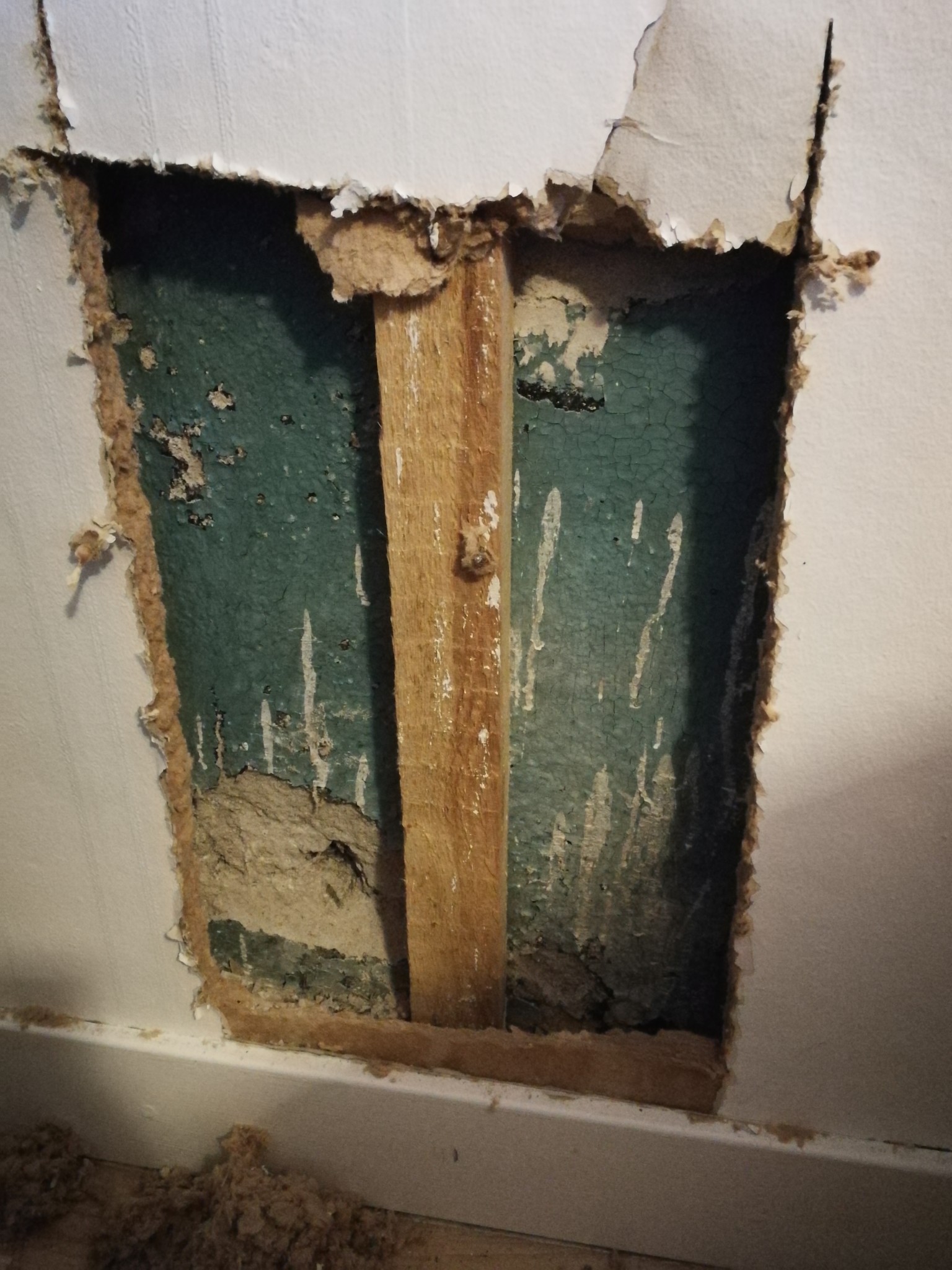 Jag är ingen expert. Men jag tror att träreglar på fuktig yttervägg är nästan 100% att det sitter mögel innanför den utreglade väggen. Såg inget mögel i hålet.