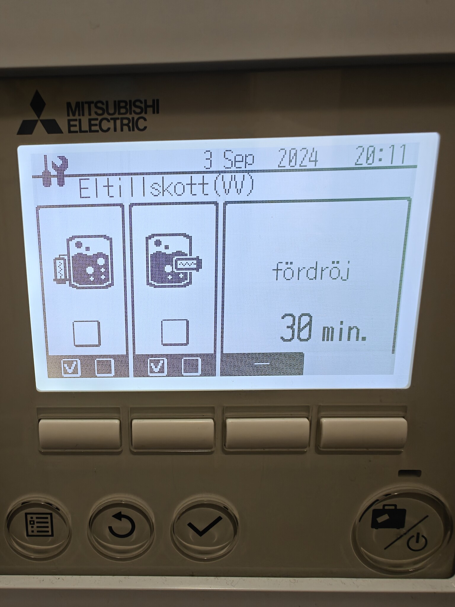 F Fideliox #1 Husägare · Skåne · 2 956 inlägg 6 sep 2024 19:30 Fideliox Husägare Skåne 2 956 inlägg 6 sep 2024 19:30 #1 Är det någon som vet hur man stänger av elpatronen för varmvatten på denna värmepumpen? Jag trodde det var följande inställning men det verkar inte som det. Inloggade ser högupplösta bilder Logga in Skapa konto Gratis och tar endast 30 sekunder #ecodan #elpatron #mitsubishi #mitsubishi-ecodan #stänga-av