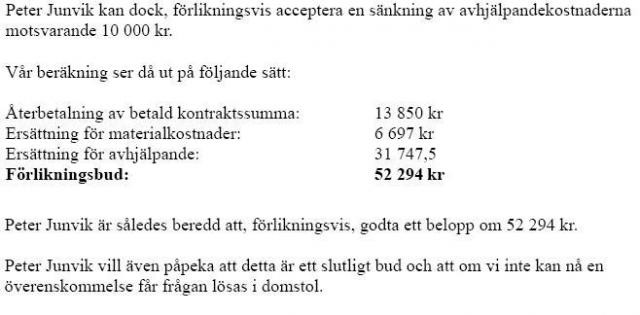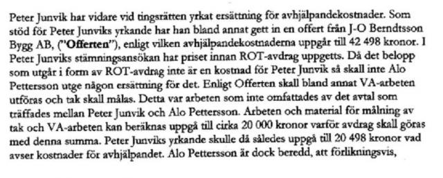 3: Alo vill göra avdrag på skadeståndskravet för ROT. Jag menar att det offererade priset (som är före ROT) är det han bör vara ersättningsskyldig för, om jag sedan får en skatterabatt så är det väl en sak mellan mig och staten och ingenting jag bör vara skyldig att rabattera honom för, även om det inte är faktisk kostnad för mig? Eller?