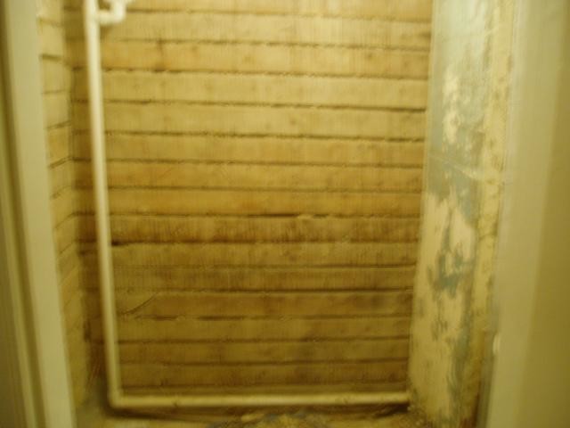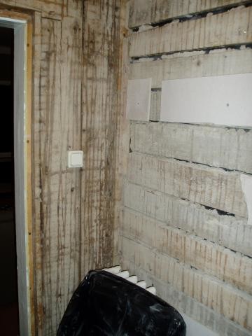 Ang väggar och golv så vet jag tyvärr inte särskilt mycket, men väggarna är byggda av liggande plank (såvitt jag förstår inte helt vanligt om man inte bor i gammalt landshövdingehus, bifogar bild där väggkonstruktionen syns) och sedan belagda med vassmatta och bruk (säger man puts?). Ovanpå detta har man några årtionden senare, när skivmaterialen gjort sitt inträde, satt någon typ av skivor. Rivning skedde dock, som synes, ner till de liggande plankorna och såvitt jag har sett lades sedan endast passbitar för att rikta de nya skivorna, alltså inga reglar (se bild 2).