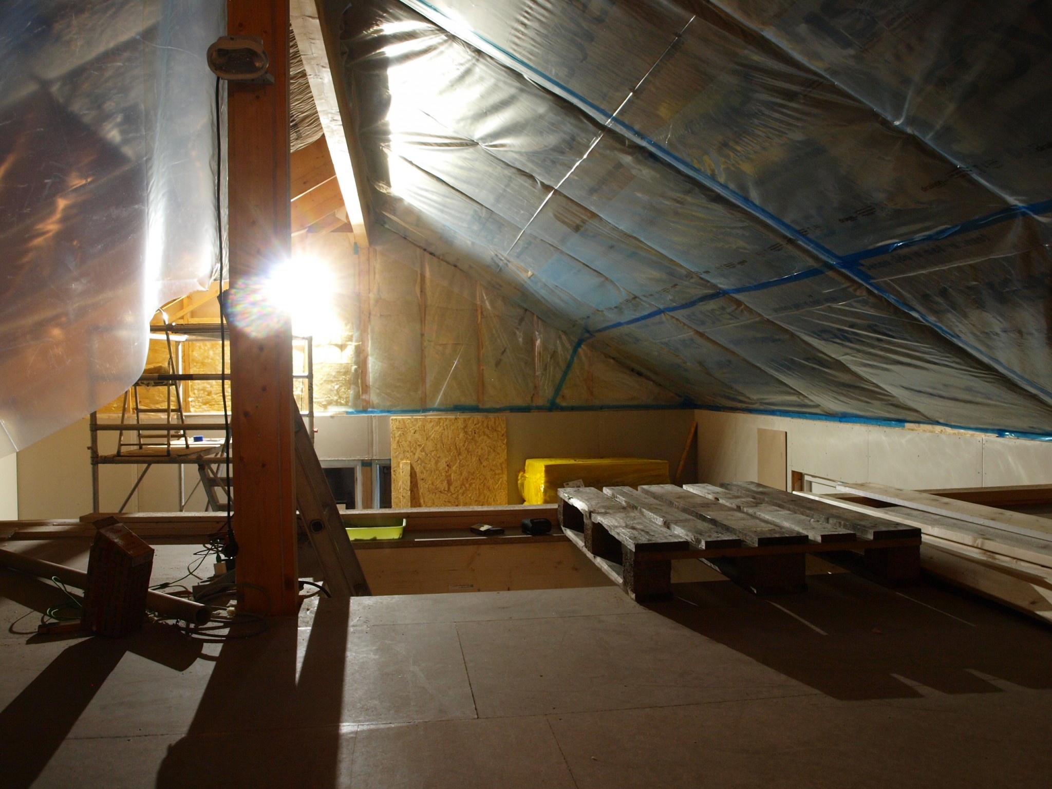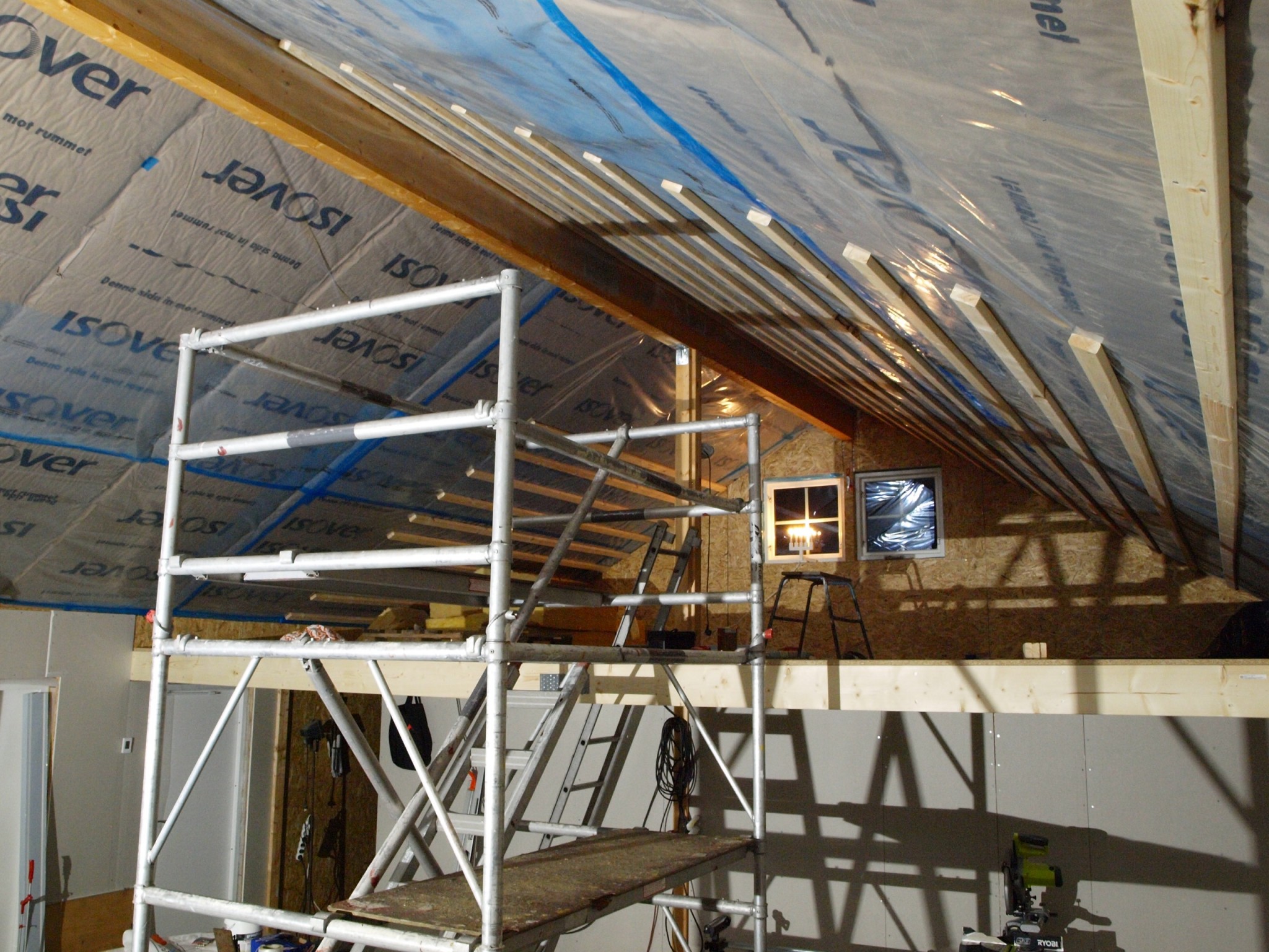 Ett race med farsan idag, jag isolerade igår och vi hjälptes åt med plasten. i veckan skall dem sista isolerbitarna på och plastas så man kan köra på värme sen