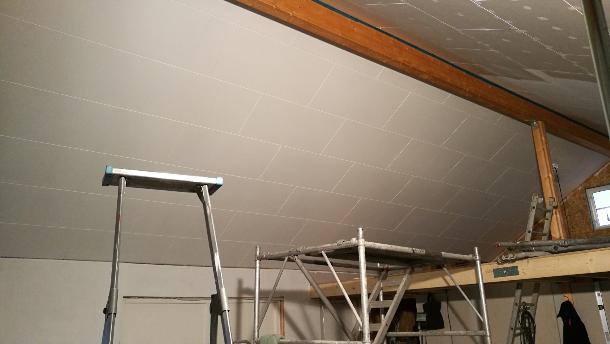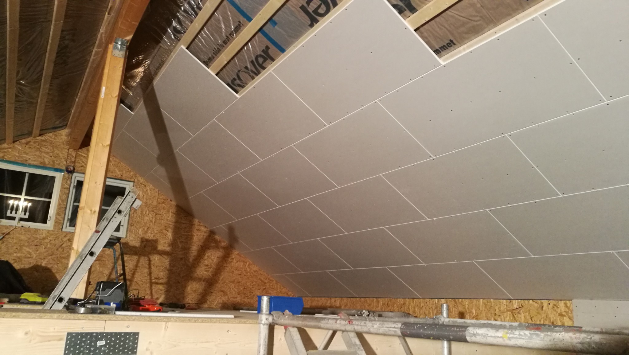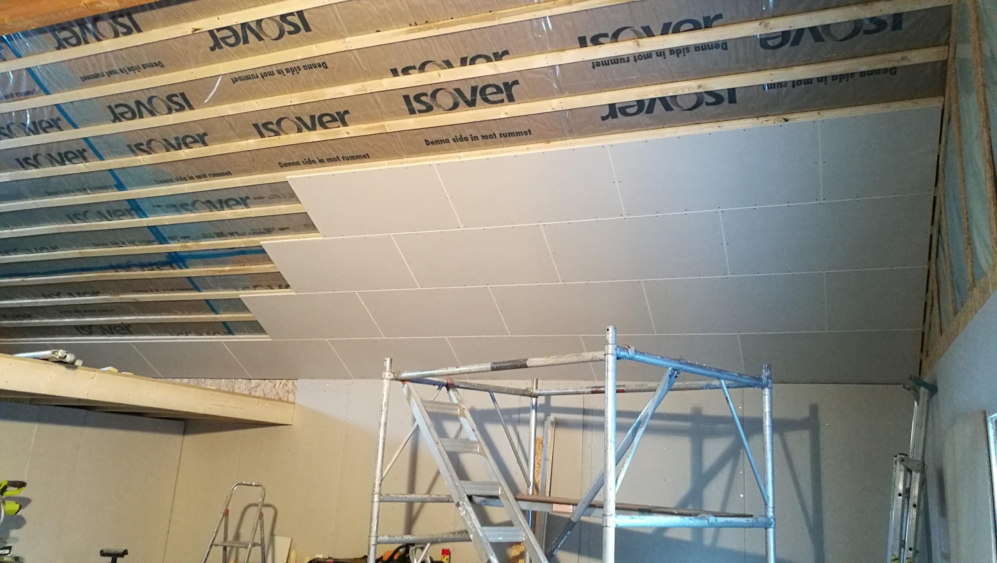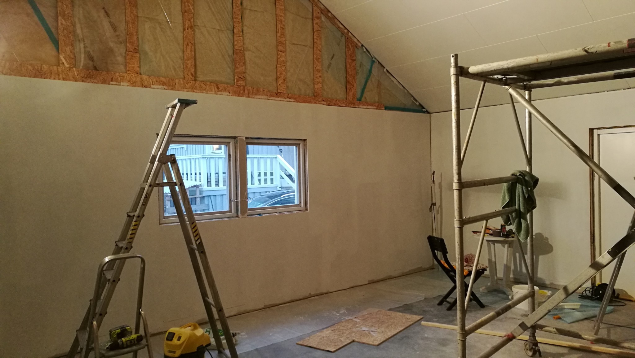 Sista dagen för 2016 avslutades med att måla klart ena halvan av taket och sen grundmålat väggarna i bildelen. Göra klart taket i veckan o sätta sista gipsen i galvarna..