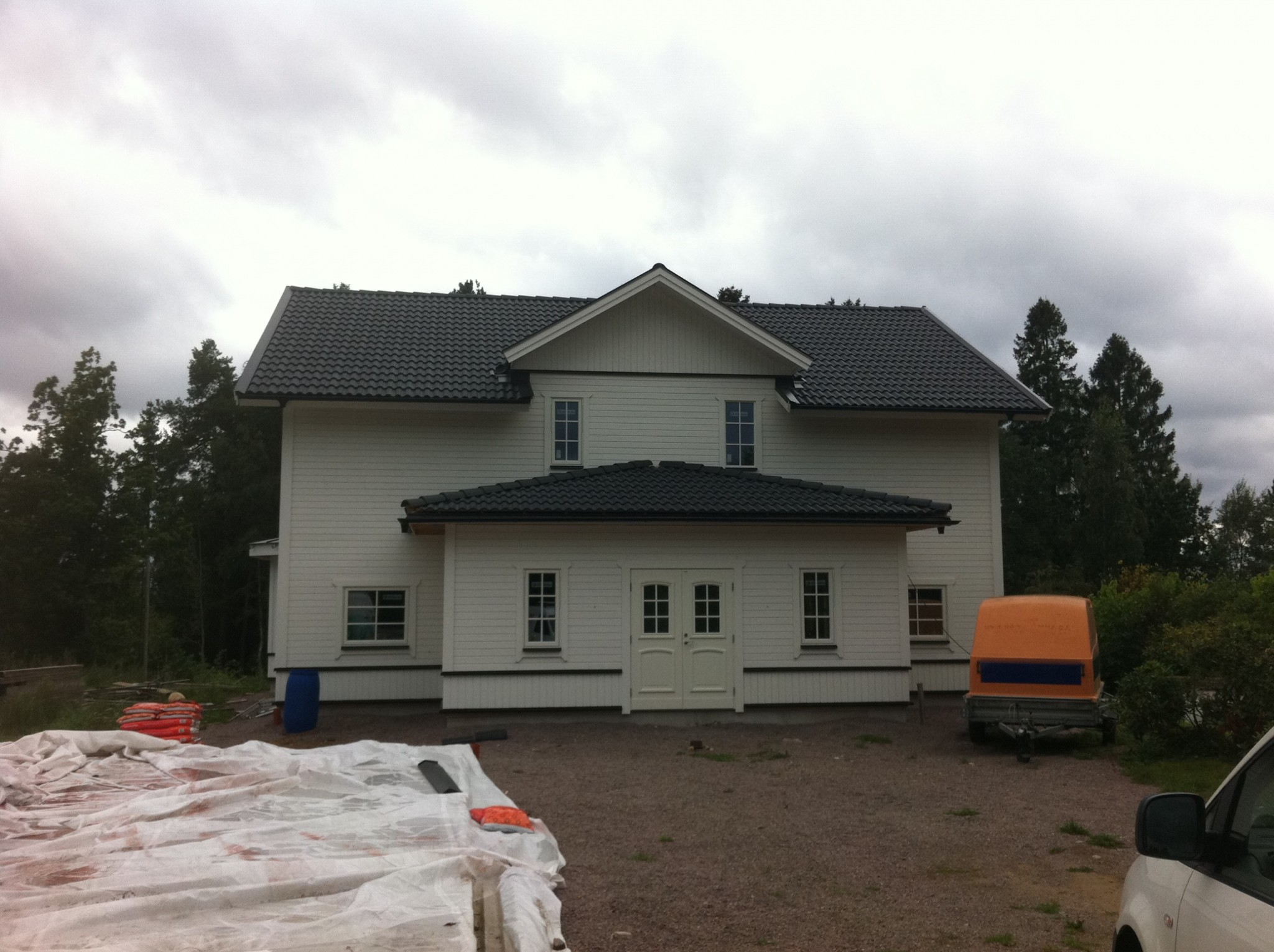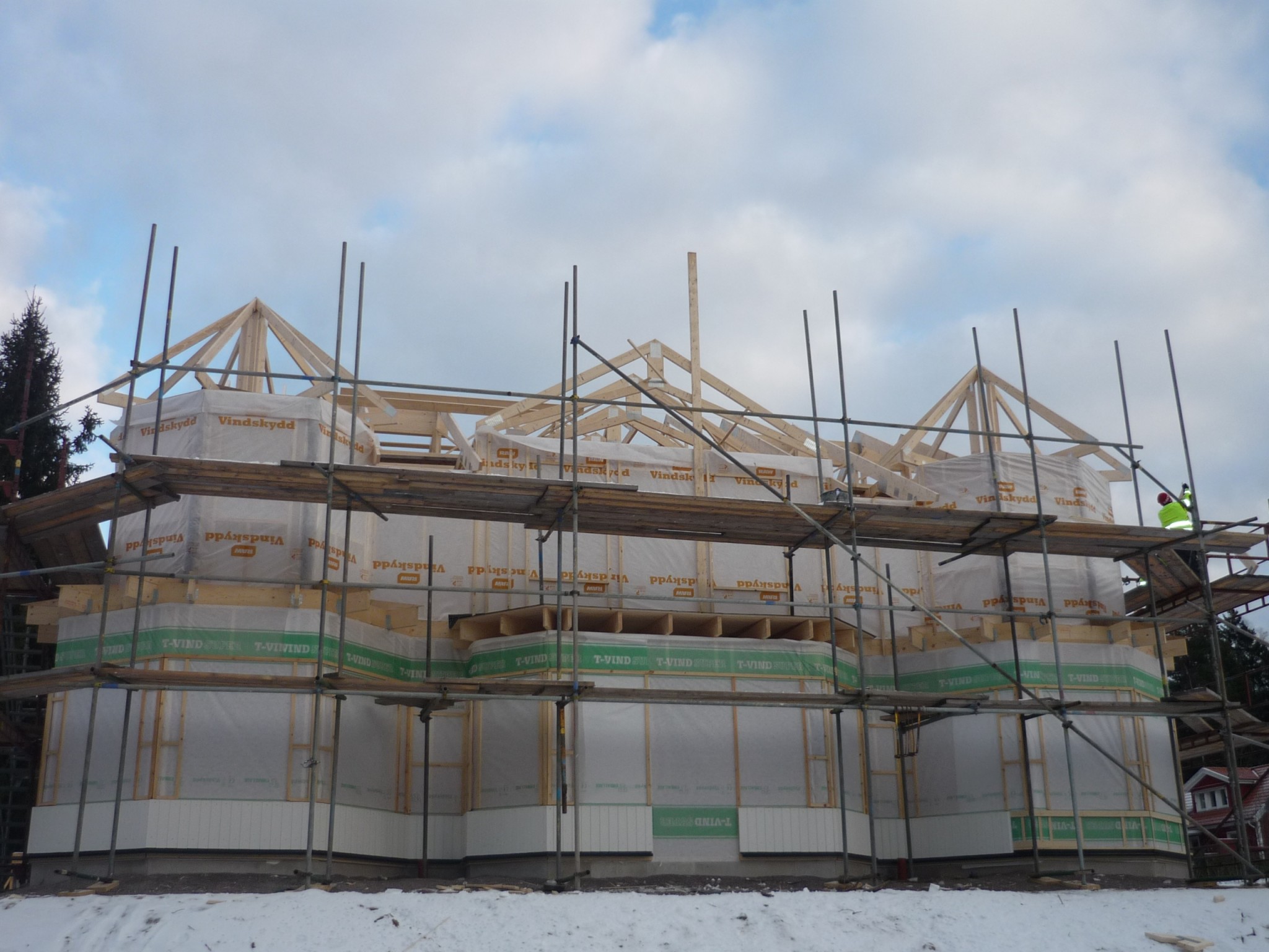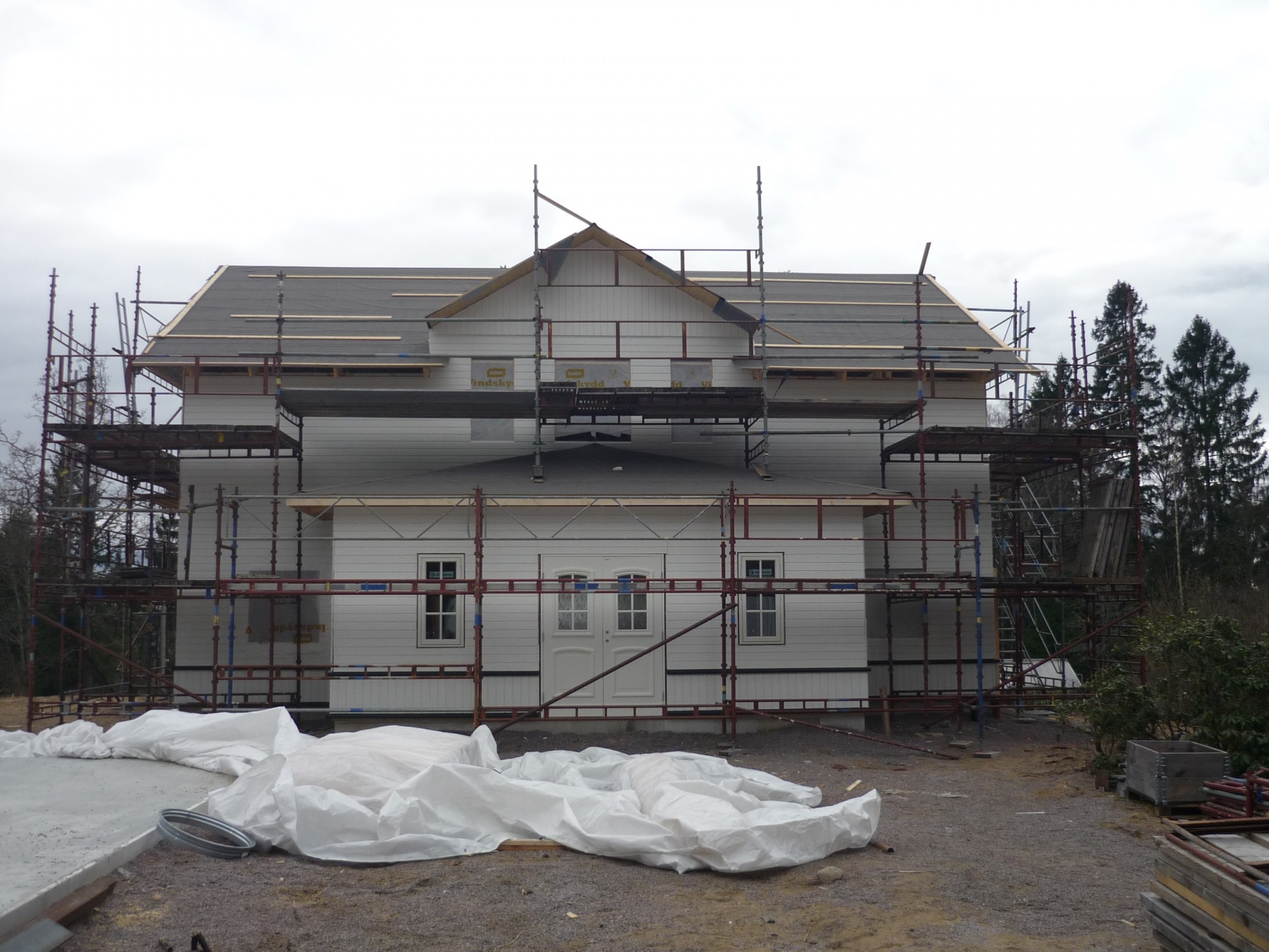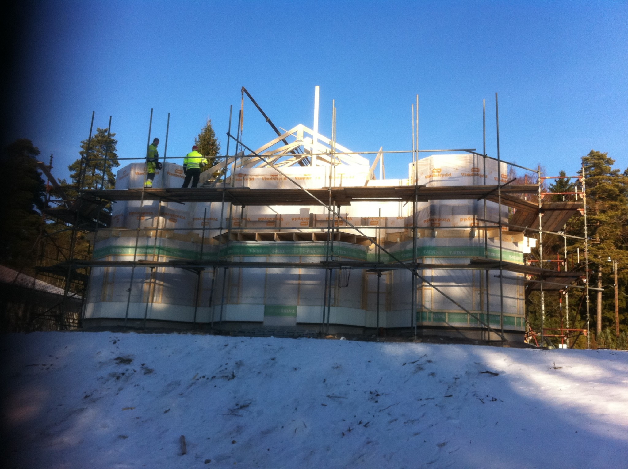 Sen har det rullat på jobbat mornar innan jobbet och kvällar efter ungarna har somnat,och söndagar,lördagarna har jag slappat med familjen.Tog hjälp av snickare när vi satte takstolar och råspontade,annars har jag gjort det mesta själv.Jo förresten farsgubben har hjälpt till med stålet i bjälklaget och målat som fan.