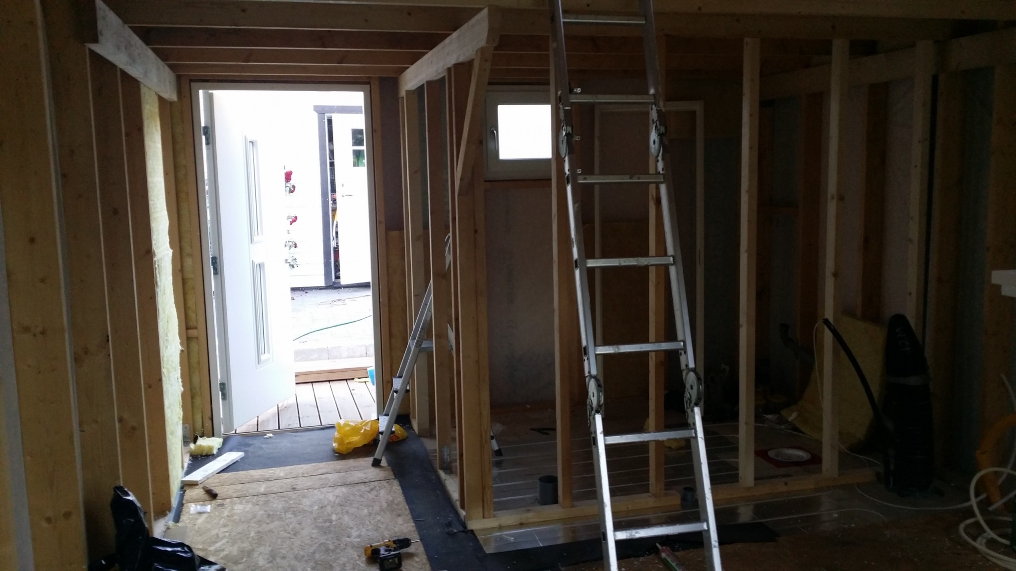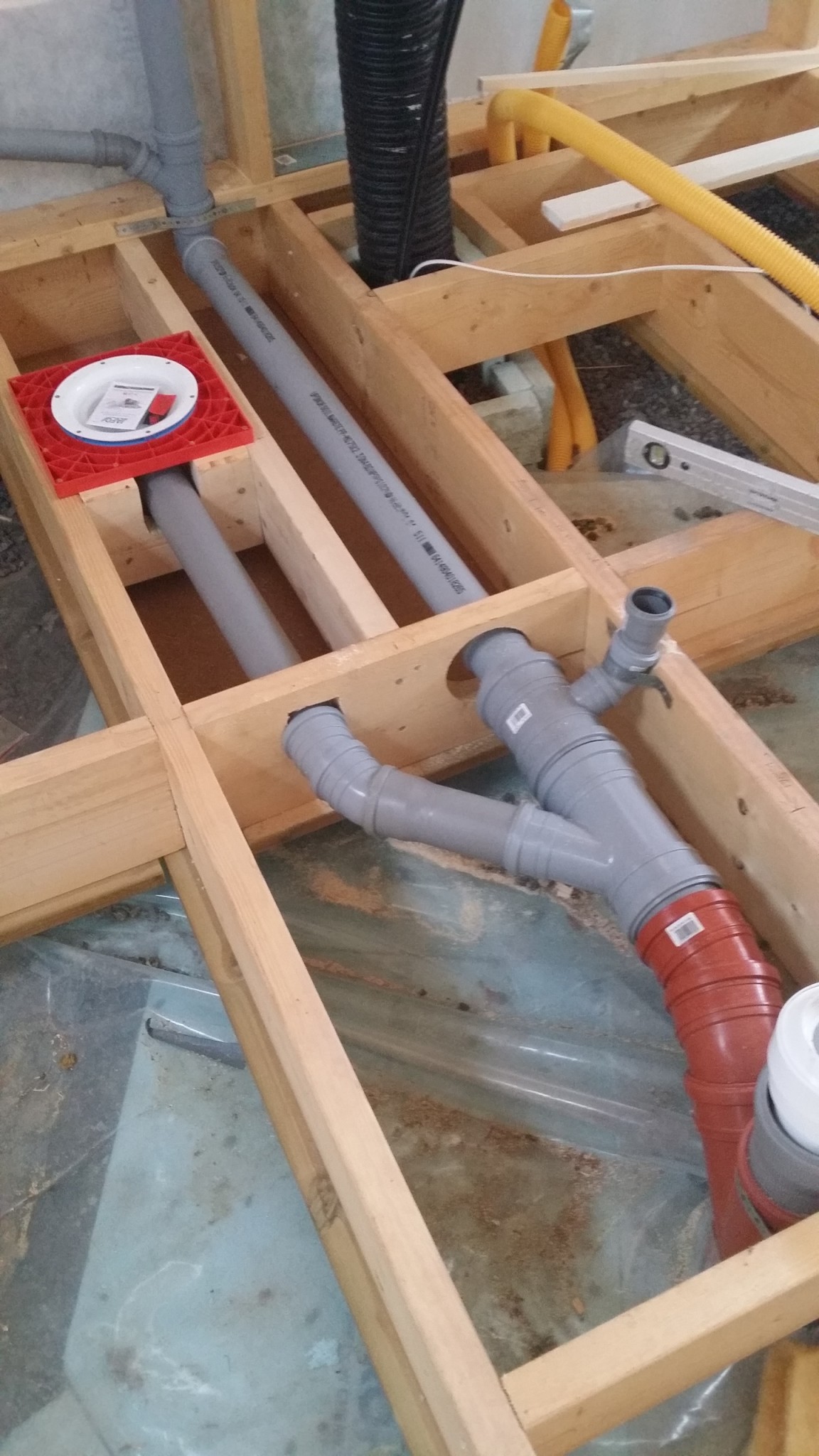 Avloppsrören och golvbrunn installerat idag. Imorgon kommer en rörmokare förbi och kollar på det innan jag börjar isolera och lägga golv. Det var praktiskt med monteringsramen när golvbrunnen skulle monteras. Blir enkelt sen med golvspånskivorna.
