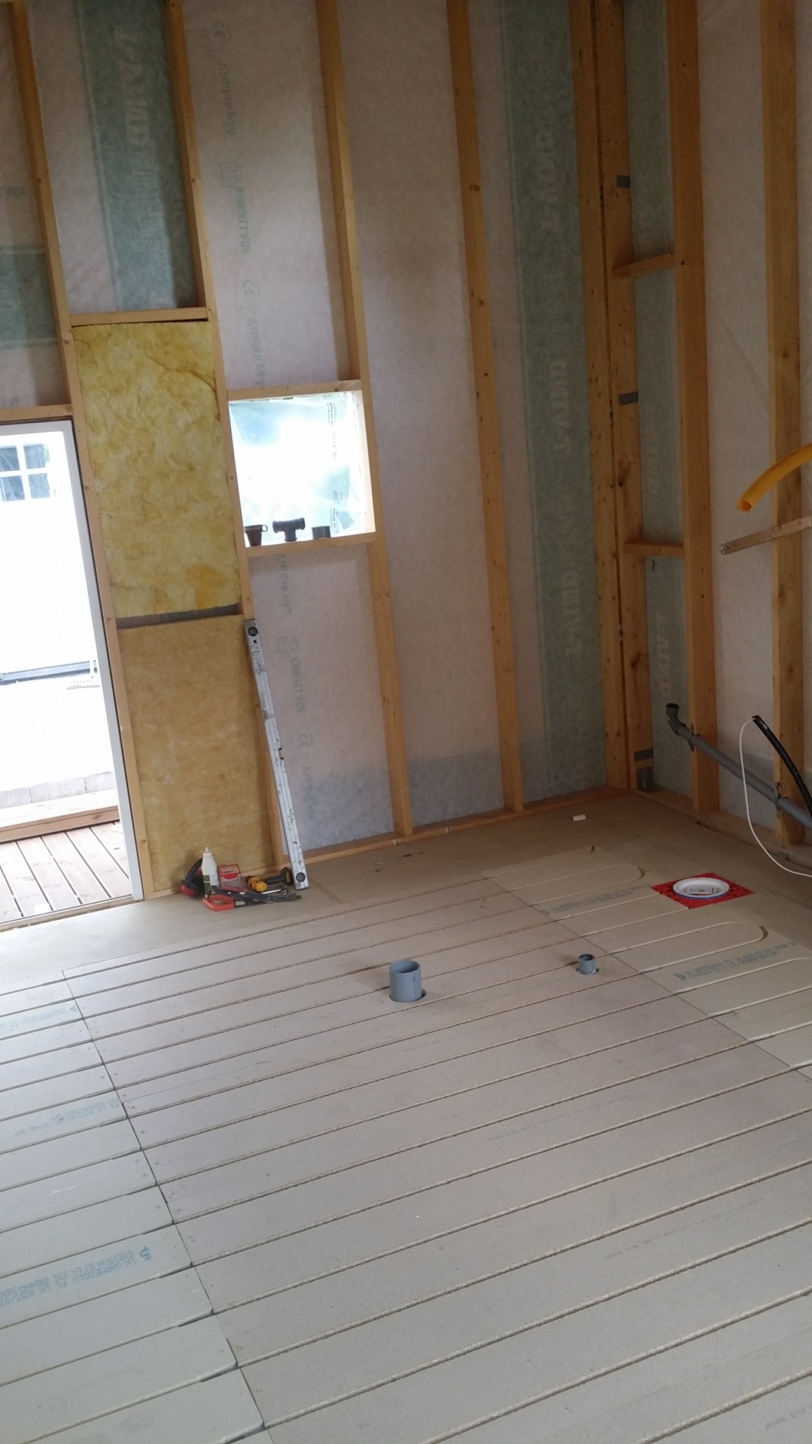Med en handöverfräs fick jag göra spår så att slangen till golvvärmen börjar och slutar där shunten ska sitta. Det blir trångt där vatten värme och el kommer in. Där ska också en vv beredare sitta. Försöker tränga ihop allt på samma ställe så att det inte tar så mycket plats under lofttrappen där i det lilla "köket" 😉 också ska få plats.