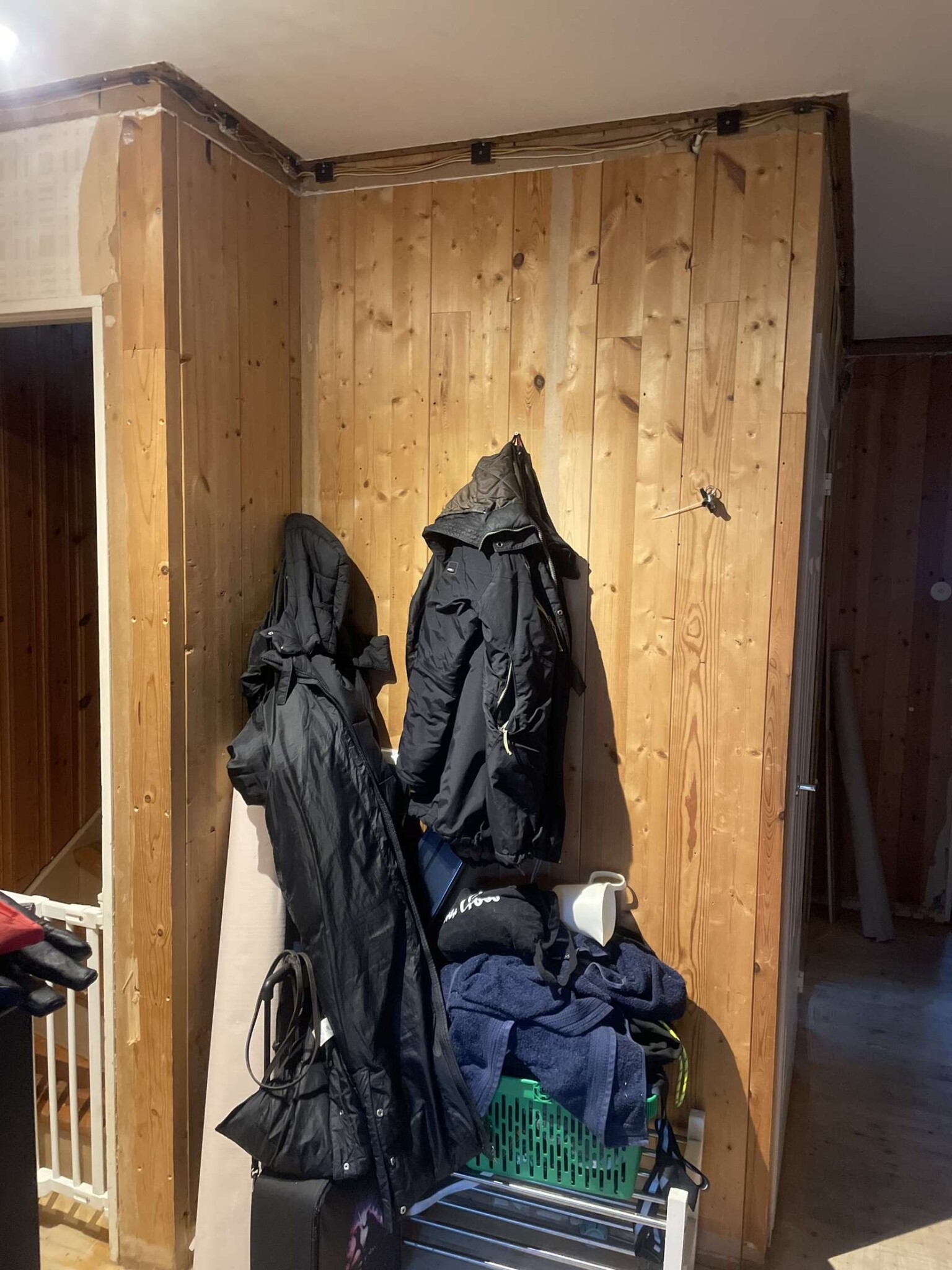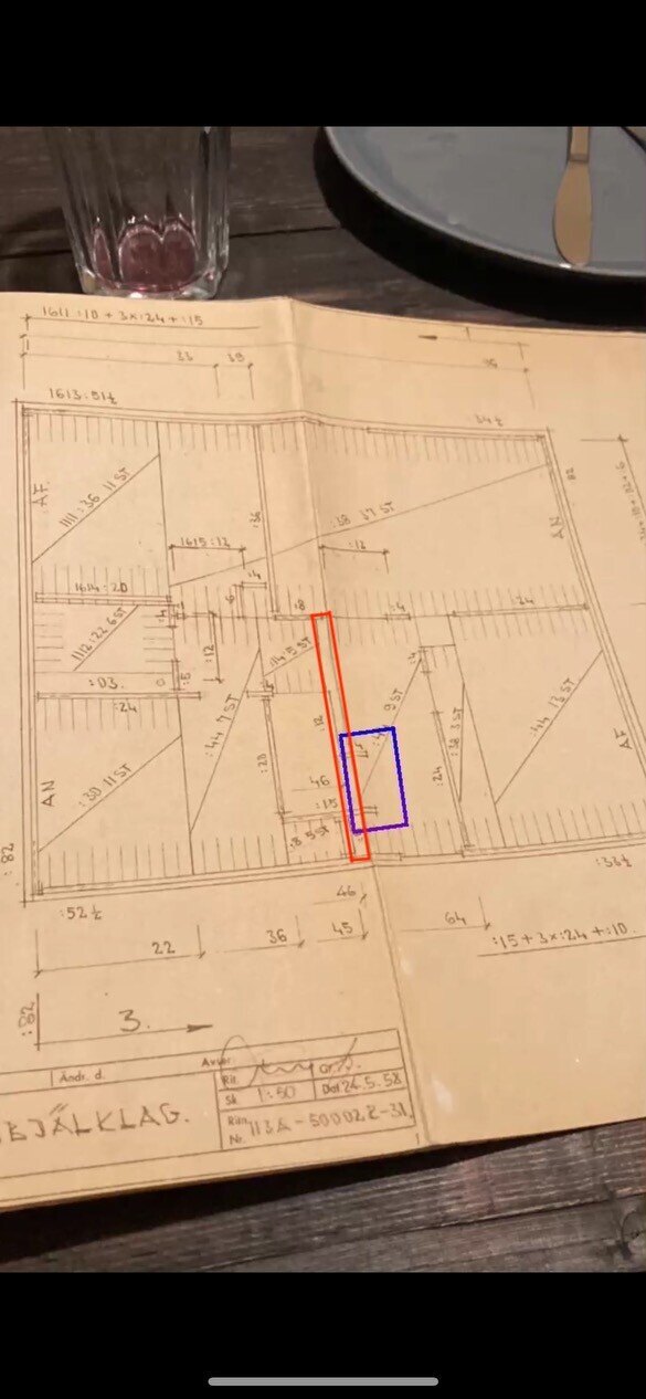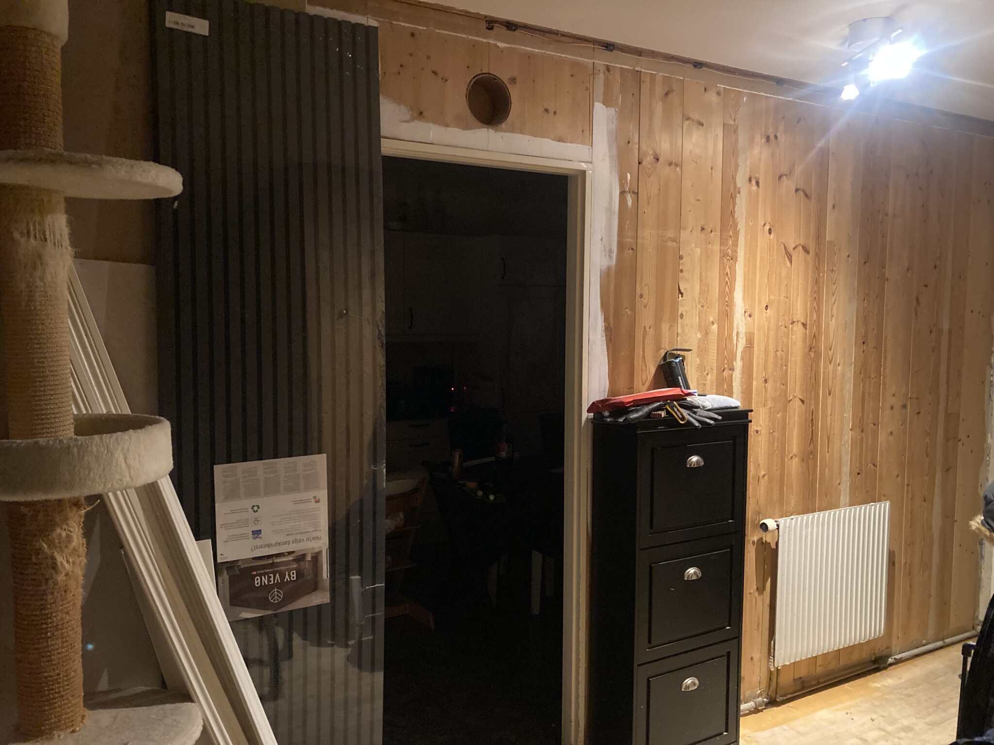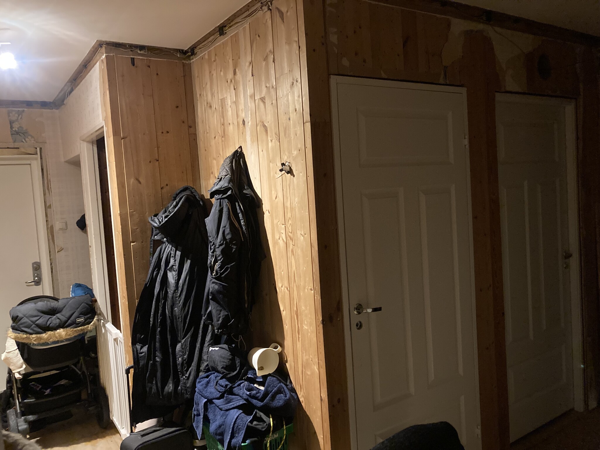 Du ser på bilden där det hänger massa jackor och ett skoställ. Den korta väggen där med en karm i. Är det blå markerade på bildenB bearmaniac skrev:Åh, men du har ju golvelementen frilagda på ovanvåningen. Perfekt! Då kan du se vilka väggar som absolut inte får tas ner, och vilka väggar som bara stärker upp.
